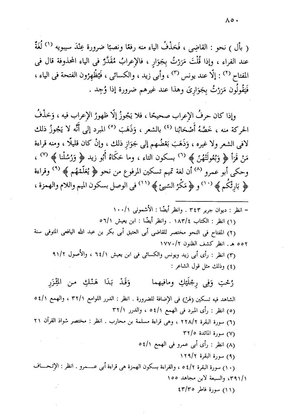 (بأل) نحو: القاضي، فحذف الياء منه رفعًا ونصبًا ضرورة عند سيبويه لغة عند الفراء، وإذا قلت مررت بجوار، فالإعراب مقدر في الياء المحذوفة قال في المفتاح: إلا عند يونس، وأبي زيد، والكسائي، فيظهرون الفتحة في الياء، فيقولون مررت بجواري وهذا عند غيرهم ضرورة إذا وجد.