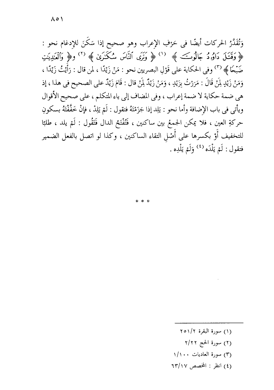 وتقدر الحركات أيضًا في حرف الإعراب وهو صحيح إذا سكن للإدغام نحو: [وقتل داود جالوت] [وترى الناس سكارى] و [العاديات ضبحا] وفي الحكاية على قول البصريين نحو: من زيدًا، لمن قال: رأيت زيدًا، ومن زيد لمن قال: مررت بزيد، ومن زيد لمن قال: قام زيد على الصحيح في هذا، إذ هي ضمة حكاية لا ضمة إعراب، وفي المضاف إلى ياء المتكلم، على صحيح الأقوال ويأتي في باب الإضافة وأما نحو: يلد إذا جزمته فتقول: لم يلد، فإن خففته بسكون حركة العين، فلا يمكن الجمع بين ساكنين، فتفتح الدال فتقول: لم يلد، طلبًا للتخفيف أو بكسرها على أصل التقاء الساكنين، وكذا لو اتصل بالفعل الضمير فتقول: لم يلده ولم يلده.