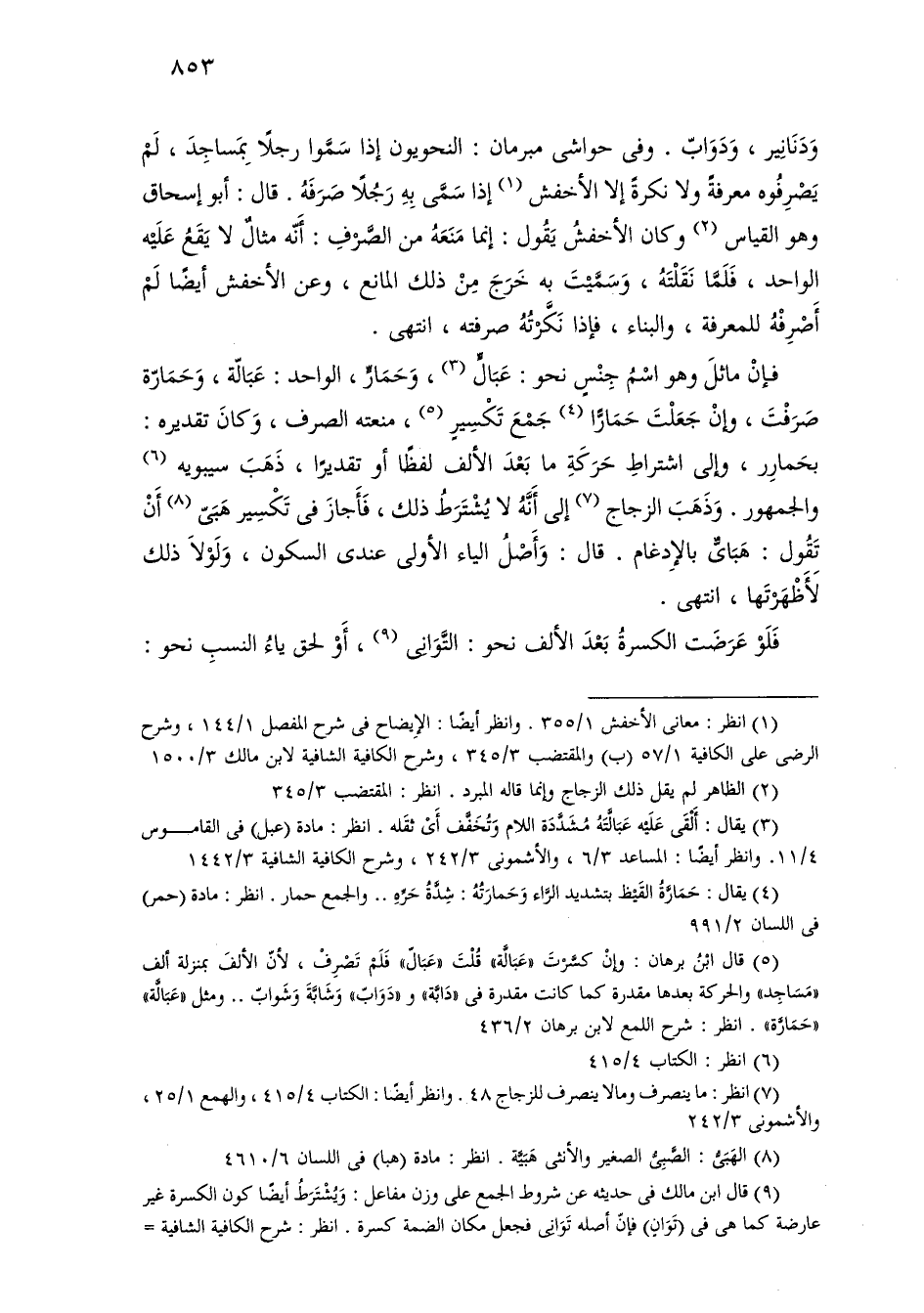 ودنانير، ودواب. وفي حواشي مبرمان: النحويون إذا سموا رجلاً بمساجد، لم يصرفوه معرفة ولا نكرة إلا الأخفش إذا سمى به رجلاً صرفه. قال: أبو إسحاق وهو القياس وكان الأخفش يقول: إنما منعه من الصرف: أنه مثال لا يقع عليه الواحد، فلما نقلته، وسميت به خرج من ذلك المانع، وعن الأخفش أيضًا لم أصرفه للمعرفة، والبناء، فإذا نكرته صرفته، انتهى.