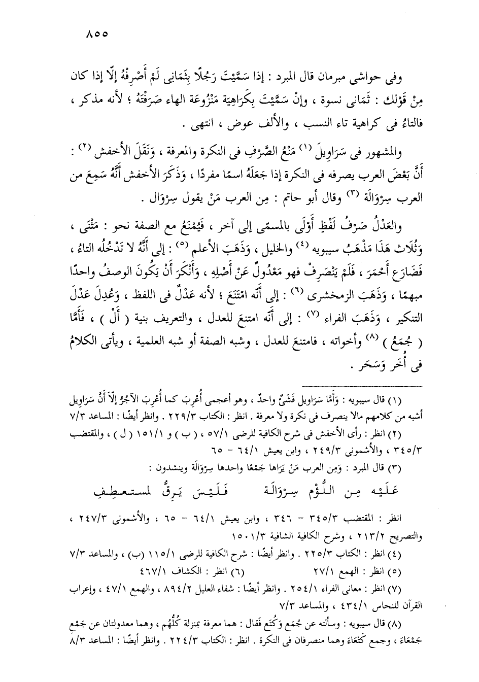 وفي حواشي مبرمان قال المبرد: إذا سميت رجلاً بثماني لم أصرفه إلا إذا كان من قولك: ثماني نسوة، وإن سميت بكراهية منزوعة الهاء صرفته؛ لأنه مذكر، فالتاء في كراهية تاء النسب، والألف عوض، انتهى.