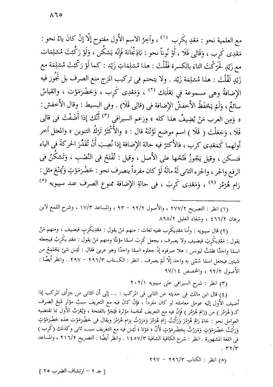 مع العلمية نحو: معد يكرب، وآخر الاسم الأول مفتوح إلا إن كان ياء نحو: معدى كرب، وقالى قلا، أو نونًا نحو: باذنجانية فإنه يسكن، ولو ركبت مسلمات مع زيد لحركت التاء بالكسرة فقلت: هذا مسلمات زيد: كما لو ركبت مسلمة مع زيد لقلت: هذا مسلمة زيد. ولا يتحتم في تركيب المزج منع الصرف بل تجوز فيه الإضافة وهي مسموعة في بعلبك، ومعدى كرب، وحضرموت، والقياس سائغ، ولم يحفظ الأخفش الإضافة في (قالى قلا). وفي البسط: وقال الأخفش: «ومن العرب من يضيف هذا كله» وزعم السيرافي أنك إذا أضفت في قالى قلا، وجعلت (قلا) اسم موضع نؤنته قال: «والأكثر ترك التنوين» والمعتل آخر أولهما كمعدى كرب، فالأكثر فيه حالة الإضافة إذا نصب أن تقدر الحركة في الياء فتسكن، وقيل يجوز فتحها على الأصل، وقيل: تفتح في النصب، وتسكن في الرفع والجر، والجزء الثاني له ماله لو كان مفردًا ينصرف نحو: حضرموت ويمنع مثل: رام هرمز، ومعدى كرب، في حالة الإضافة ممنوع الصرف عند سيبويه