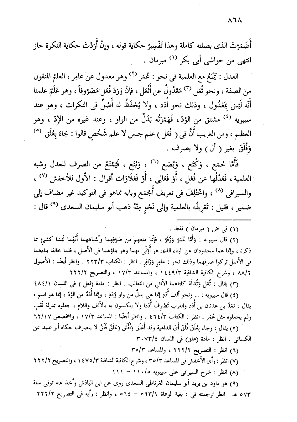 العدل: يمنع مع العملية في نحو: عمر وهو معدول عن عامر، العلم المنقول من الصفة، ونحو ثعل معدول عن أثعل، فإن ورد فعل مصروفًا، وهو علم علمنا أنه ليس بمعدول، وذلك نحو أدد، ولا يحفظ له أصل في النكرات، وهو عند سيبويه مشتق من الود، فهمزته بدل من الواو، وعند غيره من الإد، وهو العظيم، ومن الغريب أن في (فعل) علم جنس لا علم شخص قالوا: جاء بعلق وفلق بغير (أل) ولا يصرف.
