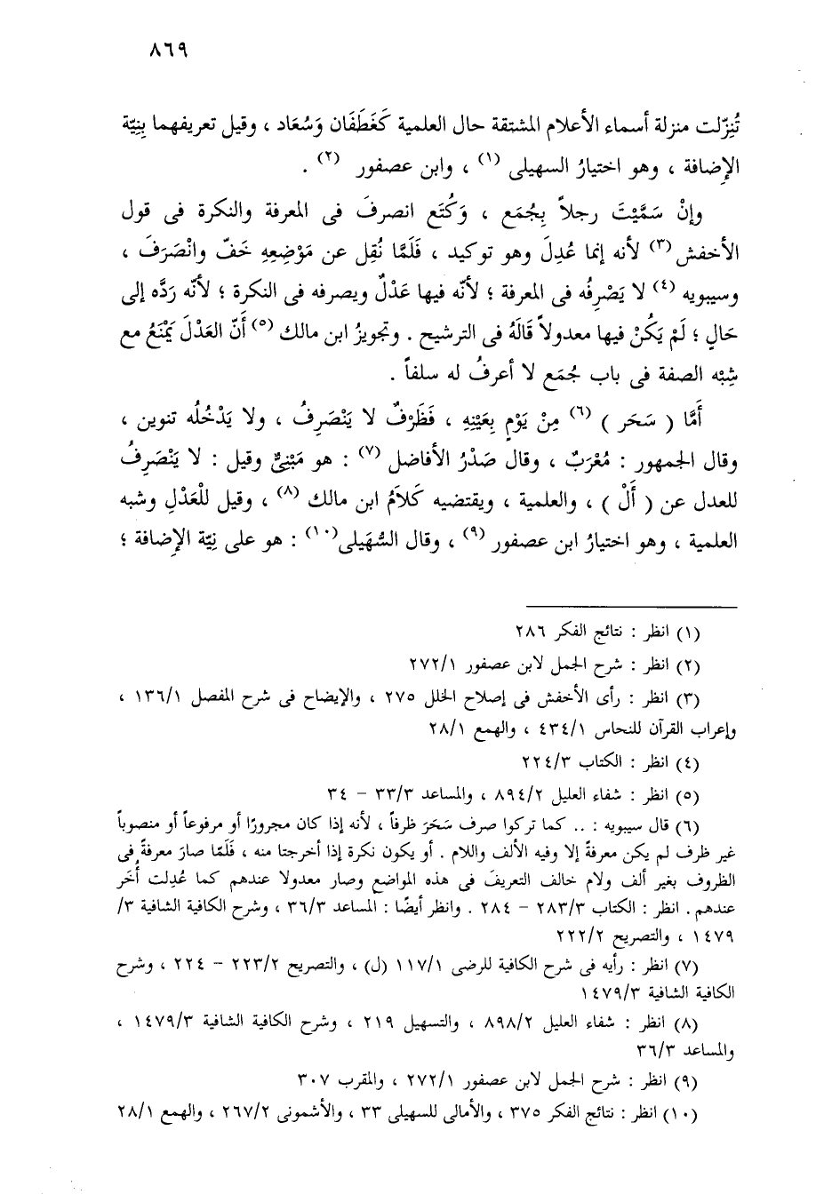 أما (سحر) من يوم بعينه، فظرف لا ينصرف، ولا يدخله تنوين، وقال الجمهور: معرب، وقال صدر الأفاضل: هو منبى وقيل: لا ينصرف للعدل عن (أل)، والعلمية، ويقتضيه كلام ابن مالك، وقيل للعدل وشبه العلمية، وهو اختيار ابن عصفور، وقال السهيلي: هو على نية الإضافة؛