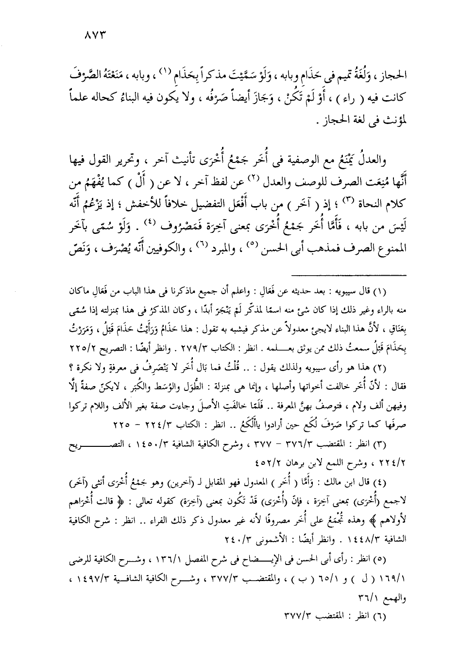 والعدل يمنع مع الوصفية في أخر جمع أخرى تأنيث آخر، وتحرير القول فيها أنها منعت الصرف للوصف والعدل عن لفظ آخر، لا عن (أل) كما يفهم من كلام النحاة؛ إذ (آخر) من باب أفعل التفضيل خلافًا للأخفش؛ إذ يزعم أنه ليس من بابه، فأما أخر جمع أخرى بمعنى آخرة فمصروف. ولو سمى بآخر الممنوع الصرف فمذهب أبي الحسن، والمبرد، والكوفيين أنه يصرف، ونص