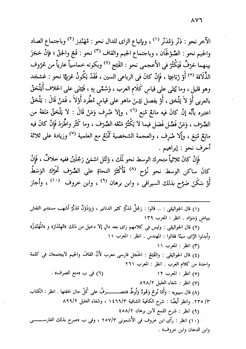 الآخر نحو: دنر ومدنر، وباتباع الزاي للدال نحو: مهندر وباجتماع الصاد والجيم نحو: الصولجان، وباجتماع الجيم والقاف نحو: قج والجق؛ فإن حجز بينهما حرف فيكثر في الأعجمي نحو: القبج وبكونه خماسيًا عاريًا من حروف الذلاقة أو رباعيًا، فإن كان في الرباعي السين، فقد يكون عربيًا نحو: عسجد وهو قليل، وما يبنى على قياس كلام العرب، وسمي به، فيبنى على الخلاف أيلحق بالعربي أو لا يلحق، أو يفصل بين ما هو على قياس مطرد أو لا، فمن قال: يلحق اعتبره بأنه إن كان فيه مانع منع، وغلا صرف ومن قال: لا يلحق منعه من الصرف، ومن فصل فصل فيما لا يكثر منعه الصرف، وما كثر واطرد فإن كان فيه مانع منع، وإلا صرف، والعجمة الشخصية تمنع مع العلمية وزيادة على ثلاثة أحرف نحو: إبراهيم.