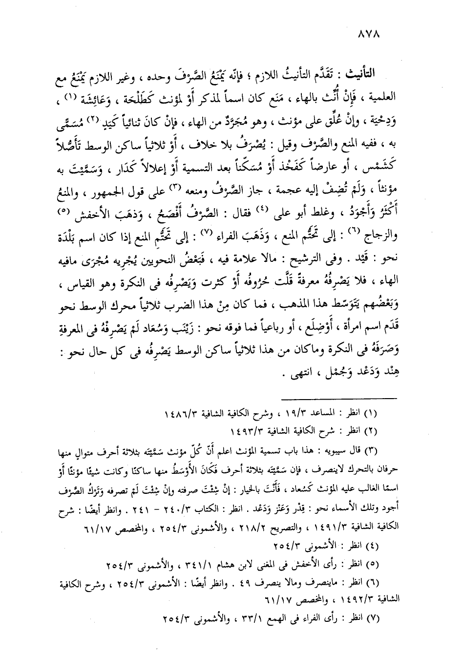 التأنيث: تقدم التأنيث اللازم؛ فإنه يمنع الصرف وحده، وغير اللازم يمنع مع العلمية، فإن أنث بالهاء، منع كان اسمًا لمذكر أو لمؤنث كطلحة، وعائشة، ودحية، وإن علق على مؤنث، وهو مجرد من الهاء، فإن كان ثنائيًا كيد مسمى به، ففيه المنع والصرف وقيل: يصرف بلا خلاف، أو ثلاثيًا ساكن الوسط تأصلاً كشمس، أو عارضًا كفخذ أو مسكنًا بعد التسمية أو إعلالاً كدار، وسميت به مؤنثًا، ولم تضف إليه عجمة، جاز الصرف ومنعه على قول الجمهور، والمنع أكثر وأجود، وغلط أبو علي فقال: الصرف أفصح، وذهب الأخفش والزجاج: إلى تحتم المنع، وذهب الفراء: إلى تحتم المنع إذا كان اسم بلدة نحو: قيد. وفي الترشيح: ما لا علامة فيه، فبعض النحويين يجريه مجرى ما فيه الهاء، فلا يصرفه معرفة قلت حروفه أو كثرت ويصرفه في النكرة وهو القياس، وبعضهم يتوسط هذا المذهب، فما كان من هذا الضرب ثلاثيًا محرك الوسط نحو قدم اسم امرأة، أو ضلع، أو رباعيًا فما فوقه نحو: زينب وسعاد لم يصرفه في المعرفة وصرفه في النكرة وما كان من هذا ثلاثيًا ساكن الوسط يصرفه في كل حال نحو: هند ودعد وجمل، انتهى.