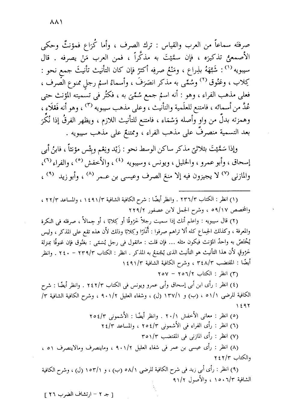 صرفته سماعًا من العرب والقياس: ترك الصرف، وأما كراع فمؤنث وحكى الأصمعي تذكيره، فإن سميت به مذكرًا، فمن العرب من يصرفه. قال سيبويه: شبهه بذراع، ومنع صرفه أكثر فإن كان التأنيث تأنيث جمع نحو: كلاب، وعنوق وسمي به مذكر انصرف، وأسماء اسم رجل ممنوع الصرف، فعلى مذهب الفراء وهو: أنه اسم جمع سمي به، فكثر في تسميته المؤنث حتى عد من أسمائه، فامتنع للعملية والتأنيث، وعلى مذهب سيبويه، وهو أنه فعلاء، وفي همزته بدل من واو وأصله وسماء، فامتنع للتأنيث اللازم، ويظهر الفرق إذا نكر بعد التسمية منصرف على مذهب الفراء، وممتنع على مذهب سيبويه.