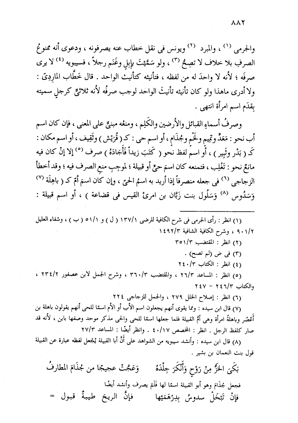 وصرف أسماء القبائل والأرضين والكلم، ومنعه مبني على المعنى، فإن كان اسم أب نحو: معد وتميم ولخم وجذام، أو اسم حي: كـ (قريش) وثقيف، أو اسم مكان: كـ (بدر وثبير)، أو اسم لفظ نحو (كتب زيدًا فأجاده) صرف إلا إن كان فيه مانع نحو: تغلب، فتمنعه كان اسم حي أو قبيلة؛ لموجب منع الصرف فيه؛ وقد أخطأ الزجاجي في جعله منصرفًا إذا أريد به اسم الحي، وإن كان اسم أم كـ (باهلة وسدوس وسلول بنت زبان بن امرئ القيس في قضاعة)، أو اسم قبيلة: