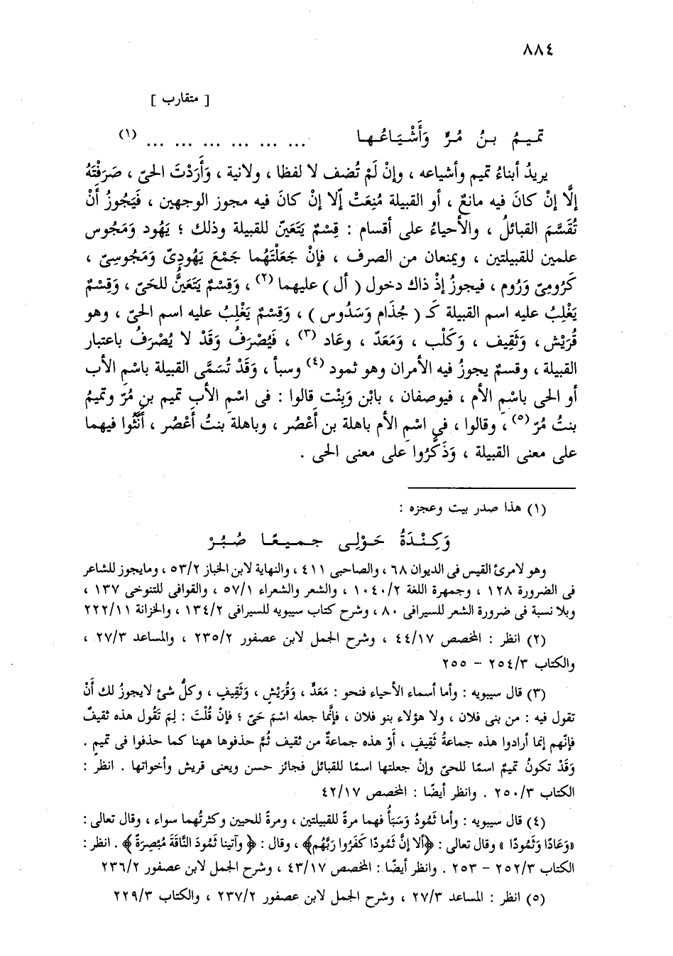 يريد أبناء تميم وأشياعه، وإن لم تضف لا لفظًا، ولا نية، وأردت الحي، صرفته غلا إن كان فيه مانع، أو القبيلة منعت إلا إن كان في مجوز الوجهين، فيجوز أن تقسم القبائل، والأحياء على أقسام: قسم يتعين للقبيلة وذلك؛ يهود ومجوس علمين للقبيلتين، ويمنعان من الصرف، فإن جعلتهما جمع يهودي ومجوسي، كرومي وروم، فيجوز إذ ذاك دخول (أل) عليهما، وقسم يتعين للحي، وقسم يغلب عليه اسم القبيلة كـ (جذام وسدوس)، وقسم يغلب عليه اسم الحي، وهو قريش، وثقيف، وكلب، ومعد، وعاد، فيصرف وقد لا يصرف باعتبار القبيلة، وقسم يجوز فيه الأمران وهو ثمود وسبأ، وقد تسمى القبيلة باسم الأب أو الحي باسم الأم، فيوصفان، بابن وبنت قالوا: في اسم الأب تميم بن مر وتميم بنت مر، وقالوا، في اسم الأم باهلة بن أعصر، وباهلة بنت أعصر، أنثوا فيهما على معنى القبيلة، وذكروا على معنى الحي.
