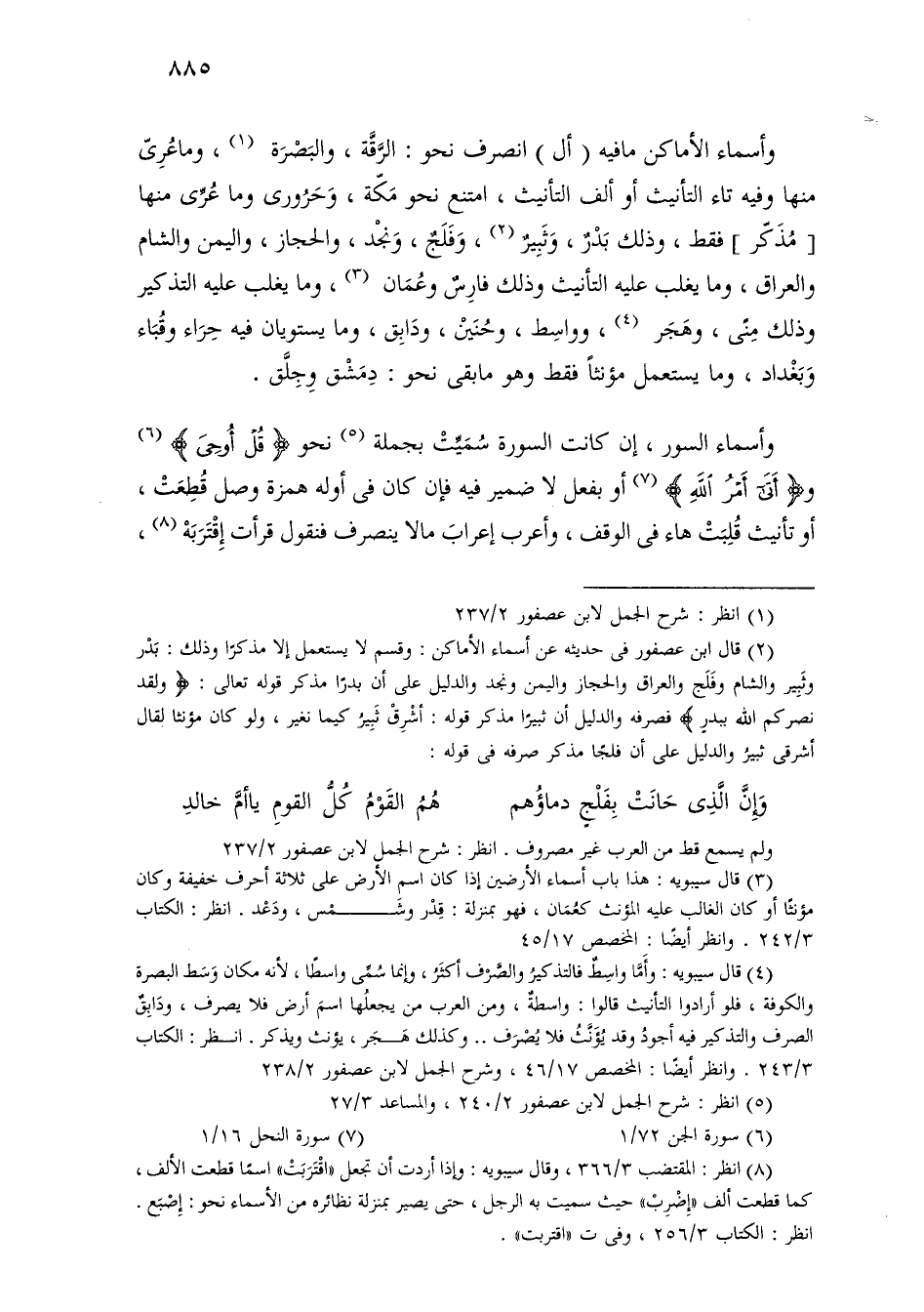 وأسماء الأماكن ما فيه (أل) انصرف نحو: الرقة، والبصرة، وما عري منها وفيه تاء التأنيث أو ألف التأنيث، امتنع نحو مكة، وحرورى وما عرى منها [مذكر] فقط، وذلك بدر، وثبير، وفلج، ونجد، والحجاز، واليمن والشام والعراق، وما يغلب عليه التأنيث وذلك فارس وعمان، وما يغلب عليه التذكير وذلك منى، وهجر، وواسط، وحنين، ودابق، وما يستويان فيه حراء وقباء وبغداد، وما يستعمل مؤنثًا فقط وهو ما بقى نحو: دمشق وجلق.