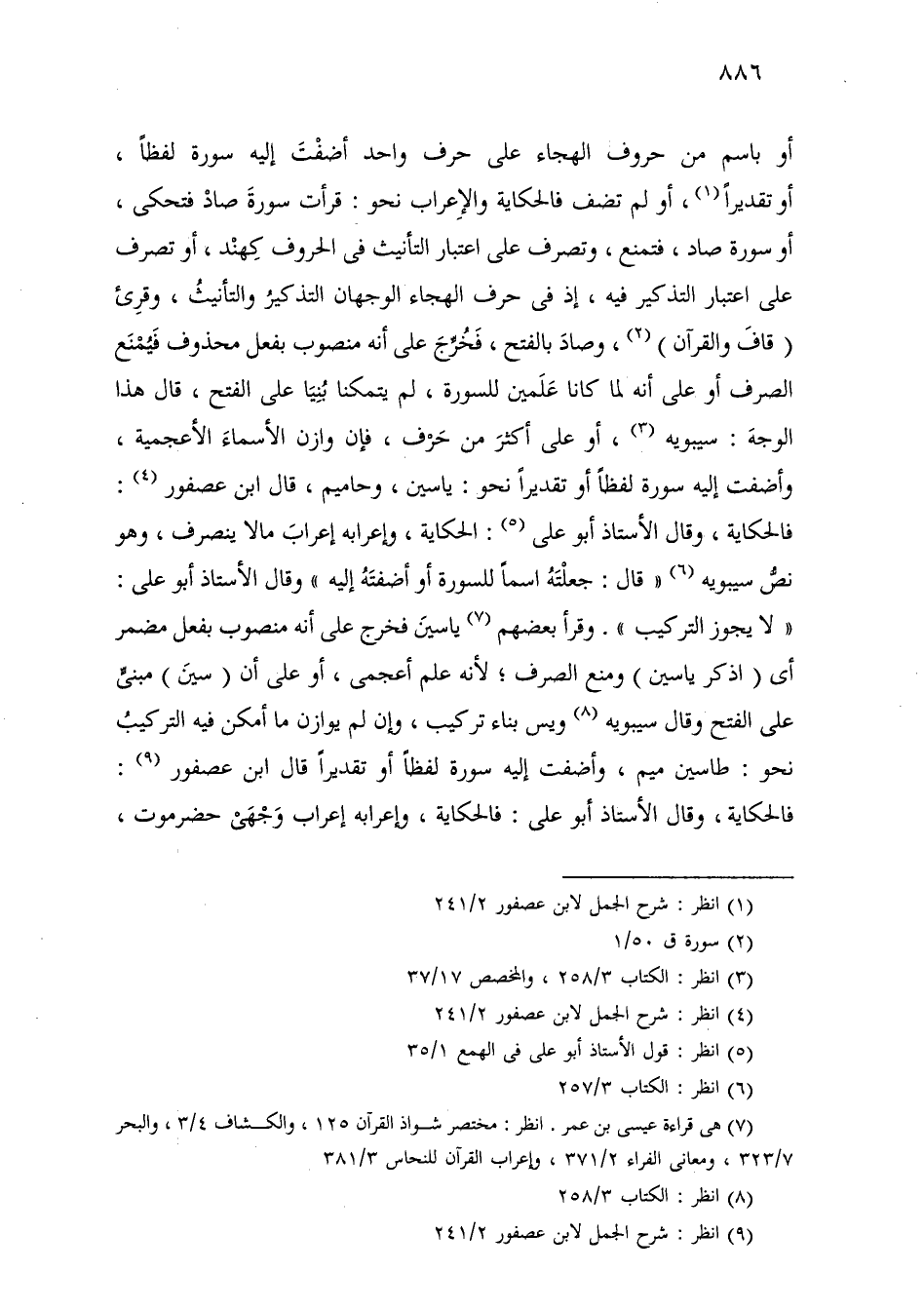 أو باسم من حروف الهجاء على حرف واحد أضفت إليه سورة لفظًا، أو تقديرًا، أو لم تضف فالحكاية والإعراب نحو: قرأت سورة صاد فتحكى، أو سورة صاد، فتمنع، وتصرف على اعتبار التأنيث في الحروف كهند، أو تصرف على اعتبار التذكير فيه، إذ في حرف الهجاء الوجهان التذكير والتأنيث، وقرئ (قاف والقرآن)، وصاد بالفتح، فخرج على أنه منصوب بفعل محذوف فيمنع الصرف أو على أنه لما كانا علمين للسورة، لم يتمكنا بنيا على الفتح، قال هذا الوجه: سيبويه، أو على أكثر من حرف، فإن وازن الأسماء الأعجمية، وأضفت إليه سورة لفظًا أو تقديرًا نحو: ياسين، وحاميم، قال ابن عصفور: فالحكاية، وقال الأستاذ أبو علي: الحكاية، وإعرابه إعراب ما لا ينصرف، وهو نص سيبويه «قال: جعلته اسمًا للسورة أو أضفته إليه» وقال الأستاذ أبو علي: «لا يجوز التركيب». وقرأ بعضهم ياسين فخرج على أنه منصوب بفعل مضمر أي (اذكر ياسين) ومنع الصرف؛ لأنه علم أعجمي، أو على أن (سين) مبني على الفتح وقال سيبويه ويس بناء تركيب، وإن لم يوازن ما أمكن فيه التركيب نحو: طاسين ميم، وأضفت إليه سورة لفظًا أو تقديرًا قال ابن عصفور: فالحكاية، وقال الأستاذ أبو علي: فالحكاية، وإعرابه إعراب وجهي حضرموت،