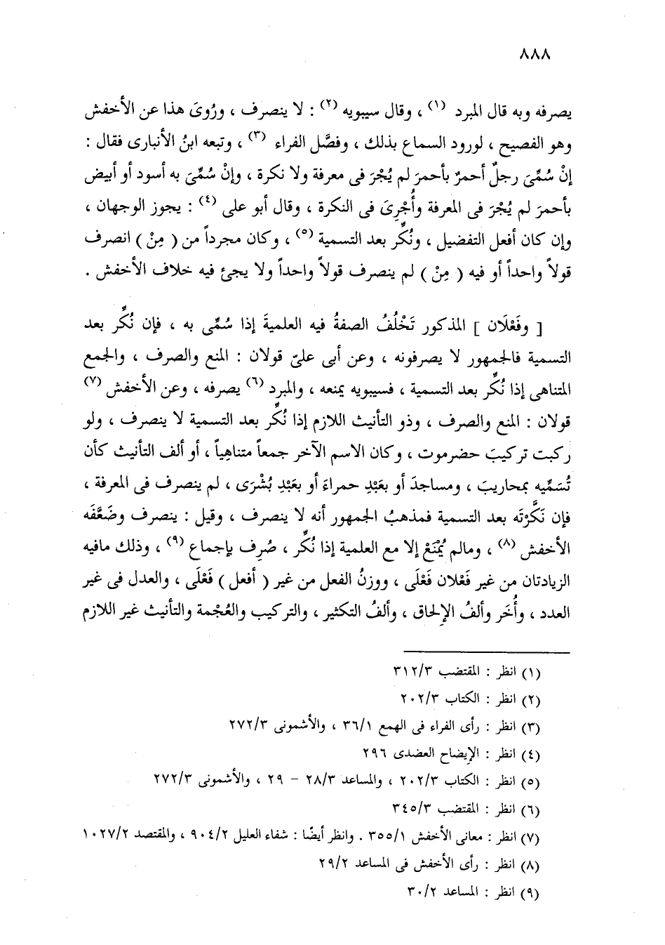 [وفعلان] المذكور تخلف الصفة فيه العلمية إذا سمي به، فإن نكر بعد التسمية فالجمهور لا يصرفونه، وعن أبي علي قولان: المنع والصرف، والجمع المتناهي إذا نكر بعد التسمية، فسيبويه يمنعه، والمبرد يصرفه، وعن الأخفش قولان: المنع والصرف، وذو التأنيث اللازم إذا نكر بعد التسمية لا ينصرف، ولو ركبت تركيب حضرموت، وكان الاسم الآخر جمعًا متناهيًا، أو ألف التأنيث كأن تسميه بمحاريب، ومساجد أو بعبد حمراء أو بعبد بشرى، لم ينصرف في المعرفة، فإن نكرته بعد التسمية فمذهب الجمهور أنه لا ينصرف، وقيل: ينصرف وضعفه الأخفش، وما لم يمنع إلا مع العلمية إذا نكر، صرف بإجماع، وذلك ما فيه الزيادتان من غير فعلان فعلى، ووزن الفعل من غير (أفعل) فعلى، والعدل في غير العدد، وأخر وألف الإلحاق، وألف التكثير، والتركيب والعجمة والتأنيث غير اللازم