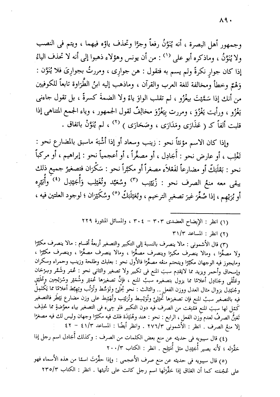 وإذا كان الاسم مؤنثًا نحو: زينب وسعاد أو إذا أشبه ما سبق بالمضارع نحو: تغلب، أو عارض نحو: أجادل، أو مصغرًا، أو أعجميًا نحو: إبراهيم، أو مركبًا نحو: بعلبك أو مضارعًا لفعلاء مصغرًا أو مكبرًا نحو: سكران فتصغير جميع ذلك يبقى معه منع الصرف نحو: زيينب وسعيد وتغيلب وأجيدل وأبيره أو بريهم، إذا صغر غير تصغير الترخيم، وبعيلبك وسكيران؛ لوجود العلتين فيه،