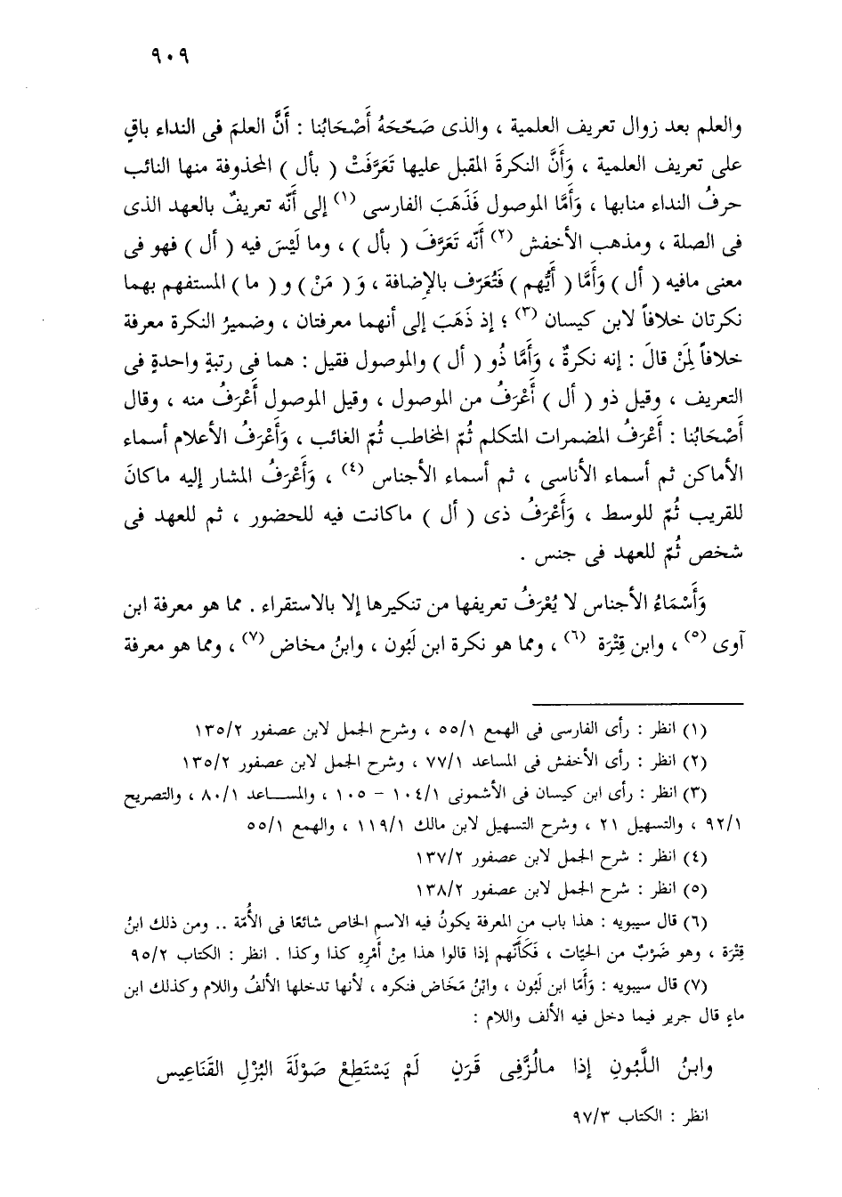 والعلم بعد زوال تعريف العلمية، والذي صححه أصحابنا: أن العلم في النداء باق على تعريف العلمية، وأن النكرة المقبل عليها تعرفت (بأل) المحذوفة منها النائب حرف النداء منابها، وأما الموصول فذهب الفارسي إلى أنه تعريف بالعهد الذي في الصلة، ومذهب الأخفش أنه تعرف (بأل)، وما ليس فيه (أل) فهو في معنى ما فيه (أل) وأما (أيهم) فتعرف بالإضافة، و (من) و (ما) المستفهم بهما نكرتان خلافًا لابن كيسان؛ إذ ذهب إلى أنهما معرفتان، وضمير النكرة معرفة خلافًا لمن قال: إنه نكرة، وأما ذو (أل) والموصول فقيل: هما في رتبة واحدة في التعريف، وقيل ذو (أل) أعرف من الموصول، وقيل الموصول أعرف منه، وقال أصحابنا: أعرف المضمرات المتكلم ثم المخاطب ثم الغائب، وأعرف الأعلام أسماء الأماكن ثم أسماء الأناسي، ثم أسماء الأجناس، وأعرف المشار إليه ما كان للقريب ثم للوسط، وأعرف ذي (أل) ما كانت فيه للحضور، ثم للعهد في شخص ثم للعهد في جنس.