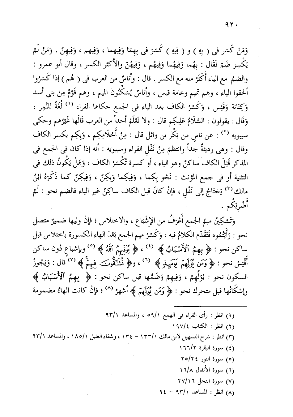 وتسكين ميم الجمع أعرف من الإشباع، والاختلاس؛ فإن وليها ضمير متصل نحو: رأيتموه فتقدم الكلام فيه، وكسر ميم الجمع بعد الهاء المكسورة باختلاس قبل ساكن نحو: [بهم الأسباب]، [يوفيهم الله] وبإشباع دون ساكن أقيس نحو: [ومن يولهم يومئذ]، و [تشقون فيهم] قال: ويجوز السكون نحو: يولهم، وفيهم وضمها قبل ساكن نحو: [بهم الأسباب] وإسكانها قبل متحرك نحو: [ومن يولهم] أشهر؛ فإن كانت الهاء مضمومة