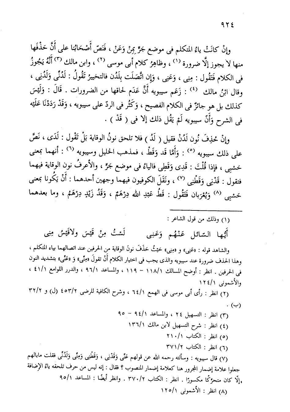 وإن حذف نون لدن فقيل (لد) فلا تلحق نون الوقاية بل تقول: لدى، نص على ذلك سيبويه: وأما قد وقط، فمذهب الخليل وسيبويه: أنهما بمعنى حسبي، فإذا قلت: قدى وقطى فالياء في موضع جر، والأعرف نون الوقاية فيهما فنقول: قدني وقطني، ونقل الكوفيون فيهما وجهين أحدهما: أن يكونا بمعنى حسبي ويعربان فتقول: قط عبد الله درهم، وقد زيد درهم، وما بعدهما