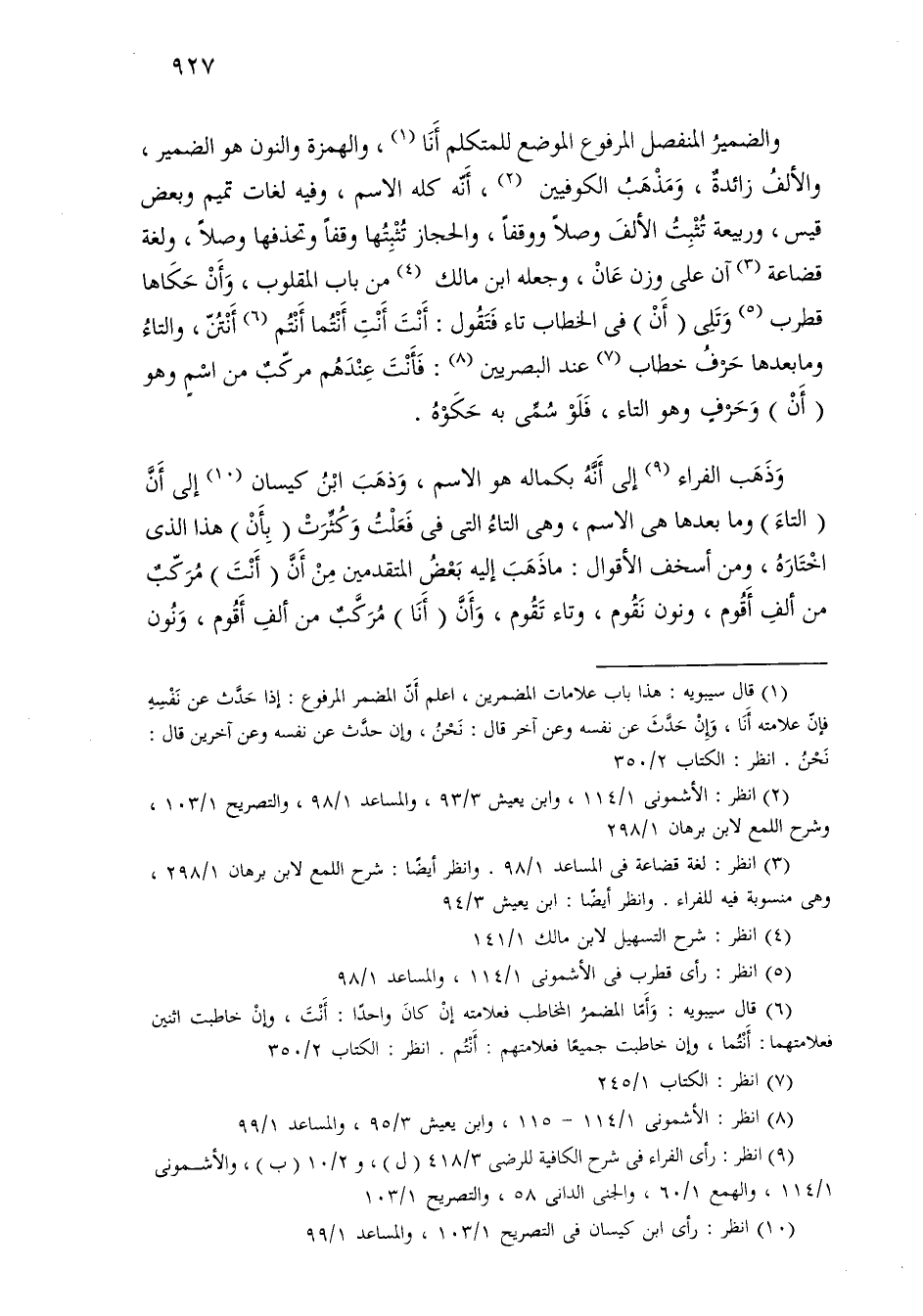 وذهب الفراء إلى أنه بكماله هو الاسم، وذهب ابن كيسان إلى أن (التاء) وما بعدها هي الاسم، وهي التاء التي في فعلت وكثرت (بأن) هذا الذي اختاره، ومن أسخف الأقوال: ما ذهب إليه بعض المتقدمين من أن (أنت) مركب من ألف أقوم، ونون نقوم، وتاء تقوم، وأن (أنا) مركب من ألف أقوم، ونون