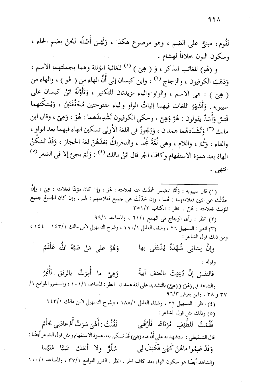 و (هو) للغائب المذكر، و (هي) للغائبة المؤنثة وهما بجملتهما الاسم، وذهب الكوفيون، والزجاج، وابن كيسان إلى أن الهاء من (هو)، والهاء من (هي): هي الاسم، والواو والياء مزيدتان للتكثير، مخففتين، ويسكنهما قيس وأسد يقولون: هو وهي، وحكى الكوفيون تشديدهما: هو، وهي، وقال ابن مالك وتشددهما همدان، ويجوز في اللغة الأولى تسكين الهاء فيهما بعد الواو، والفاء، وثم، واللام، وهي لغة نجد، والتحريك بعدهن لغة الحجاز، وقد تسكن الهاء بعد همزة الاستفهام وكاف الجر قال ابن مالك: ولم يجيء إلا في الشعر انتهى.