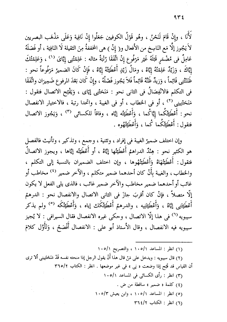وإن اختلف ضمير الغيبة في إفراد، وتثنية، وجمع، وتذكير، وتأنيث فالفصل هو الكثير نحو: هند الدراهم أعطيتها إياه، أو أعطيته إياها، ويجوز الاتصال فتقول: أعطيتهاه وأعطيتهوها، وإن اختلف الضميران بالنسبة إلى التكلم، والخطاب، والغيبة بأن كان أحدهما ضمير متكلم، والآخر ضمير مخاطب أو غائب أو أحدهما ضمير مخاطب والآخر ضمير غائب، فالذي يلي الفعل لا يكون إلا متصلاً، فإن كان أقرب جاز في الثاني الاتصال والانفصال نحو: الدرهم أعطيتني إياه، وأعطيتنيه، والدرهم أعطيتكك إياه، وأعطيتكه ولم يذكر سيبويه في هذا إلا الاتصال، وحكى غيره الانفصال فقال السيرافي: لا يجيز سيبويه فيه الانفصال، وقال الأستاذ أبو علي: الانفصال أفصح، وتأول كلام