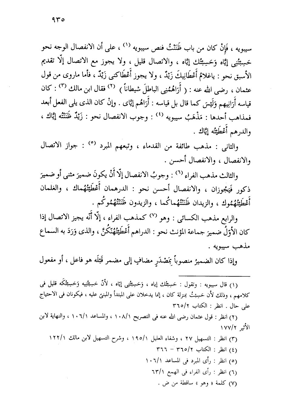 سيبويه، فإن كان من باب ظننت فنص سيبويه، على أن الانفصال الوجه نحو حسبتني إياه وحسبتك إياه، والاتصال قليل، ولا يجوز مع الاتصال إلا تقديم الأسبق نحو: يا غلام أعطانيك زيد، ولا يجوز أعطاكني زيد، فأما ما روى من قول عثمان رضي الله عنه: (أراهمني الباطل شيطانًا) فقال ابن مالك: كان قياسه أرانيهم وليس كما قال بل قياسه: أراهم إياي. وإن كان الذي يلي الفعل أبعد فمذاهب أحدها: مذهب سيبويه: وجوب الانفصال نحو: زيد ظننته إياك، والدرهم أعطيته إياك.