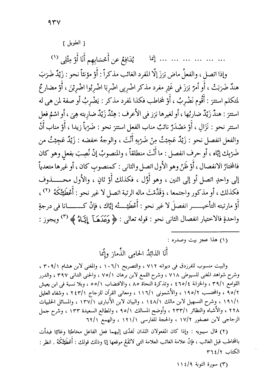 وإذا اتصل، والفعل ماض برز إلا المفرد الغائب مذكرًا: أو مؤنثًا نحو: زيد ضرب هند ضربت، أو أمر برز في غير مذكر اضربي اضربا اضربوا اضربن، أو مضارع لمتكلم استتر: أقوم نضرب، أو لمخاطب فكذا لمفرد مذكر: يضرب أو صفة لمن هي له استتر: هند زيد ضاربها، أو لغيرها برز في الأعرف: هند زيد ضاربته هي، أو اسم فعل استتر نحو: نزال، أو مصدر نائب مناب الفعل استتر نحو: ضربًا زيدا، أو مناب أن والفعل انفصل نحو: زيد عجبت من ضربه أنت، والوجه خفضه: زيد عجبت من ضربك إياه، أو حرف انفصل: ما أنت منطلقًا، والمنصوب إن نصب بفعل وهو كان فالمختار الانفصال، أو ظن وهو الأول اتصل والثاني: كمنصوب كان، أو غيرها متعديًا إلى واحد اتصل أو إلى اثنين، وهو أول، فكذلك أو ثان، والأول محذوف فكذلك، أو مذكور واجتمعا وقدمت ماله الرتبة اتصل لا غير نحو: أعطيتكه، أوما رتبته التأخير انفصل لا غير نحو: أعطيته إياك، فإن كانا في درجة واحدة فالاختيار انفصال الثاني نحو: قوله تعالى: [وعدها إياه] ويجوز: