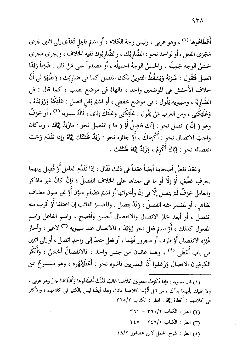 أعطاهوها، وهو عربي، وليس وجه الكلام، أو اسم فاعل تعدى إلى اثنين جرى مجرى الفعل، أو لواحد نحو: الضاربك، والضاربوك ففيه الخلاف، ويجرى مجرى حسن الوجه جميله، والحسن الوجه الجميله، أو مصدرًا على من قال: ضربًا زيدًا اتصل فتقول: ضربه ويسقط التنوين لمكان المتصل كما في ضاربك، ويظهر لي أن خلاف الأخفش في الموضعين واحد، فالهاء في موضع نصب، كما قال: في الضاربه، وسيبويه يقول: في موضع خف، أو اسم فعل اتصل: عليكه ورويده، وعليكنى، ومن العرب من يقول: عليكنى وعليك إياي، قاله سيبويه، أو حرف وهو (إن) اتصل نحو: إنك فاضل أو (ما) انفصل نحو: ما زيد إياك، وما كان واجب الاتصال نحو: أكرمك، أو جائزه نحو: زيد ظننتك إياه وإذا تقدم وجب انفصاله نحو: إياك أكرم، وزيد إياه ظننتك.