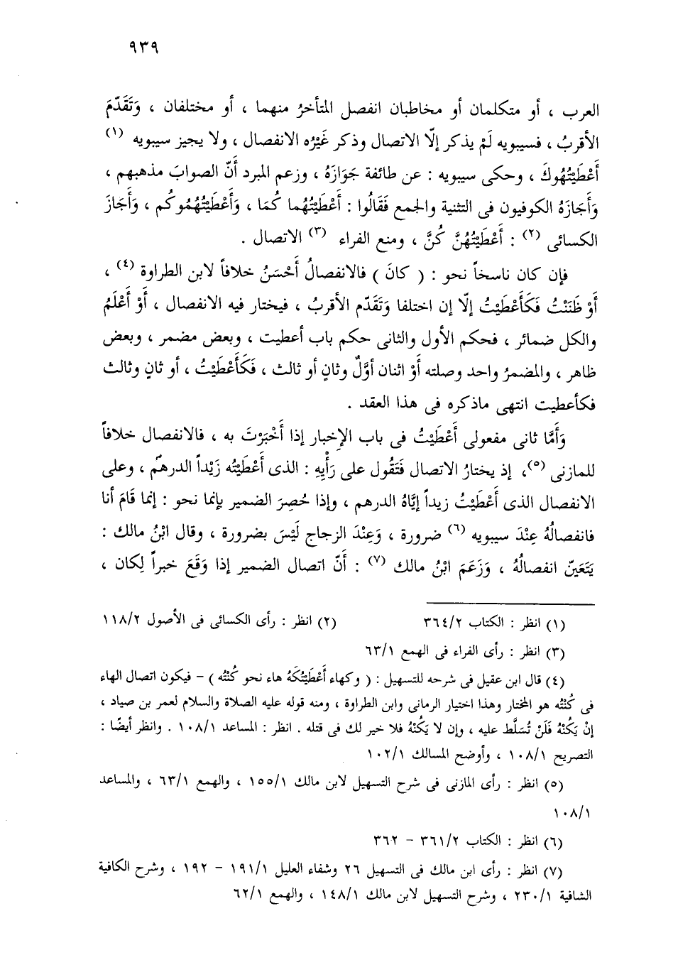 العرب، أو متكلمان أو مخاطبان انفصل المتأخر منهما، أو مختلفان، وتقدم الأقرب، فسيبويه لم يذكر إلا الاتصال وذكر غيره الانفصال، ولا يجيز سيبويه أعطيتهوك، وحكى سيبويه: عن طائفة جوازه، وزعم المبرد أن الصواب مذهبهم، وأجازه الكوفيون في التثنية والجمع فقالوا: أعطيهما كما، وأعطيتهموكم، وأجاز الكسائي: أعطيتهن كن، ومنع الفراء الاتصال.
