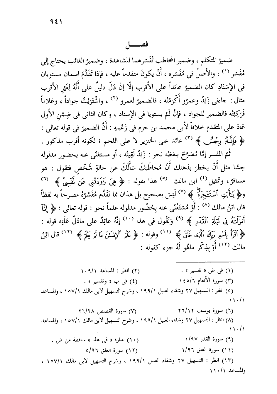 ضمير المتكلم، وضمير المخاطب تفسيرهما المشاهدة، وضمير الغائب يحتاج إلى مفسر، والأصل في مفسره، أن يكون متقدمًا عليه، فإذا تقدم اسمان مستويان في الإسناد كان الضمير عائدًا على الأقرب إلا إن دل دليل على أنه لغير الأقرب مثال: جاءني زيد وعمرو أكرمته، فالضمير لعمرو، واشتريت جوادًا، وغلامًا فركبته فالضمير للجواد، فإن لم يستويا في الإسناد، وكان الثاني في ضمن الأول عاد على المتقدم خلافًا لأبي محمد بن حزم في زعمه: أن الضمير في قوله تعالى: [فإنه رجس] عائد على الخنزير لا على اللحم؛ لكونه أقرب مذكور.