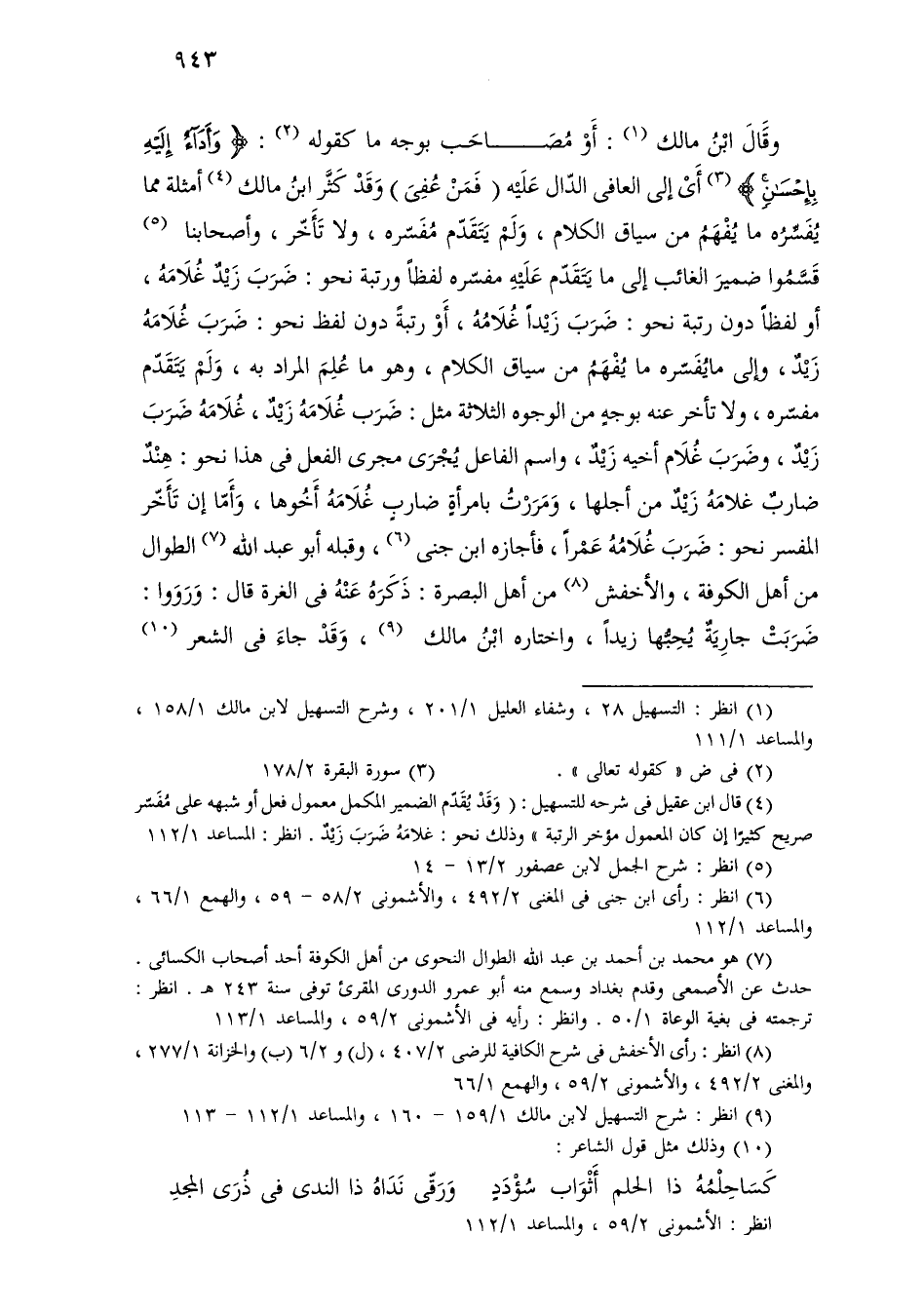 وقال ابن مالك: أو مصاحب بوجه ما كقوله: [وأداء إليه بإحسان] أي إلى العافي الدال عليه (فمن عفى) وقد كثر ابن مالك أمثلة مما يفسره ما يفهم من سياق الكلام، ولم يتقدم مفسره، ولا تأخر، وأصحابنا قسموا ضمير الغائب إلى ما يتقدم عليه مفسره لفظًا ورتبة نحو: ضرب زيد غلامه، أو لفظًا دون رتبة نحو: ضرب زيدًا غلامه، أو رتبة دون لفظ نحو: ضرب غلامه زيد، وإلى ما يفسره ما يفهم من سياق الكلام، وهو ما علم المراد به، ولم يتقدم مفسره، ولا تأخر عنه بوجه من الوجوه الثلاثة مثل: ضرب غلامه زيد، غلامه ضرب زيد، وضرب غلام أخيه زيد، واسم الفاعل يجرى مجرى الفعل في هذا نحو: هند ضارب غلامه زيد من أجلها، ومررت بامرأة ضارب غلامه أخوها، وأما إن تأخر المفسر نحو: ضرب غلامه عمرًا، فأجازه ابن جني، وقبله أبو عبد الله الطوال من أهل الكوفة، والأخفش من أهل البصرة: ذكره عنه في الغرة قال: ورووا: ضربت جارية يحبها زيدًا، واختاره ابن مالك، وقد جاء في الشعر