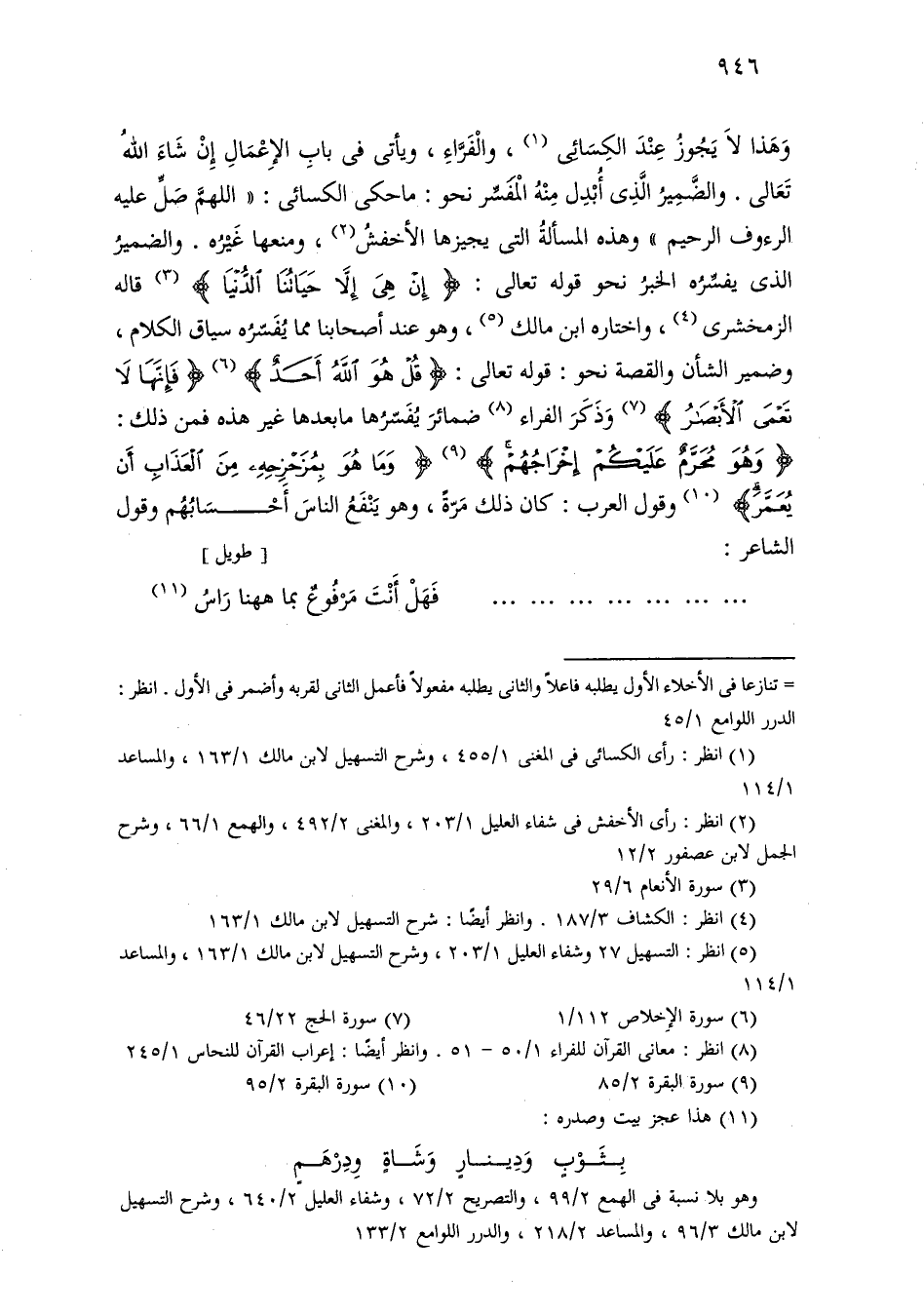 وهذا لا يجوز عند الكسائي، والفراء، ويأتي في باب الإعمال إن شاء الله تعالى. والضمير الذي أبدل منه المفسر نحو: ما حكى الكسائي: «اللهم صل عليه الرءوف الرحيم» وهذه المسألة التي يجيزها الأخفش، ومنعها غيره. والضمير الذي يفسره الخبر نحو قوله تعالى: [إن هي إلا حياتنا الدنيا] قاله الزمخشري، واختاره ابن مالك، وهو عند أصحابنا مما يفسره سياق الكلام، وضمير الشأن والقصة نحو: قوله تعالى: [قل هو الله أحد] [فإنها لا تعمى الأبصار] وذكر الفراء ضمائر يفسرها ما بعدها غير هذه فمن ذلك: [وهو محرم عليكم إخراجهم] [وما هو بمزحزحه من العذاب أن يعمر] وقول العرب: كان ذلك مرة، وهو ينفع الناس أحسابهم وقول الشاعر: