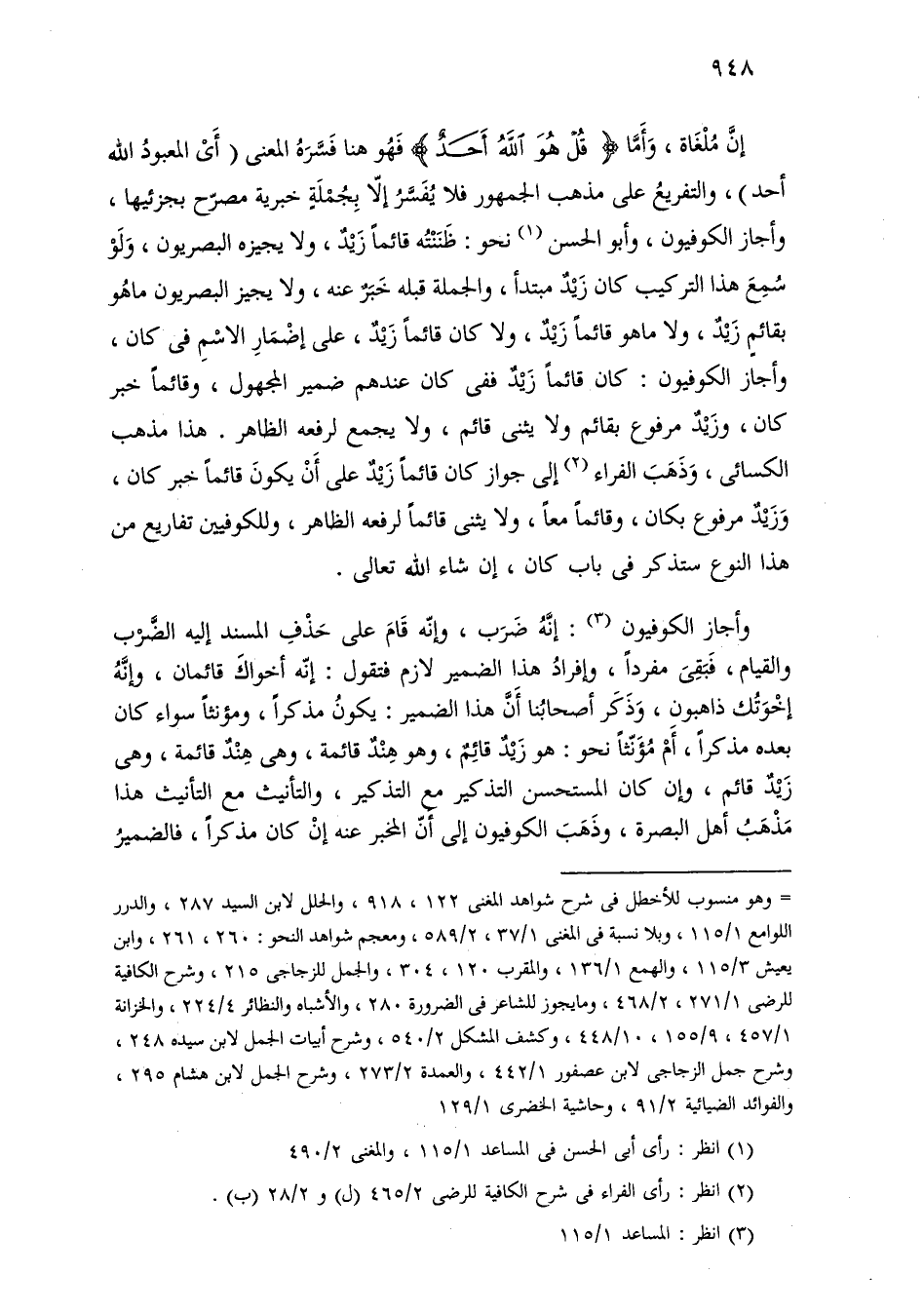 إن ملغاة، وأما [قل هو الله أحد] فهو هنا فسره المعنى (أي المعبود الله أحد)، والتفريع على مذهب الجمهور فلا يفسر إلا بجملة خبرية مصرح بجزئيها، وأجاز الكوفيون، وأبو الحسن نحو: ظننته قائمًا زيد، ولا يجيزه البصريون، ولو سمع هذا التركيب كان زيد مبتدأ، والجملة قبله خبر عنه، ولا يجيز البصريون ما هو بقائم زيد، ولا ما هو قائمًا زيد، ولا كان قائمًا زيد، على إضمار الاسم في كان، وأجاز الكوفيون: كان قائمًا زيد ففي كان عندهم ضمير المجهول، وقائمًا خبر كان، وزيد مرفوع بقائم ولا يثنى قائم، ولا يجمع لرفعه الظاهر. هذا مذهب الكسائي، وذهب الفراء إلى جواز كان قائمًا زيد على أن يكون قائمًا خبر كان، وزيد مرفوع بكان، وقائمًا معًا، ولا يثنى قائمًا لرفعه الظاهر، وللكوفيين تفاريع من هذا النوع ستذكر في باب كان، إن شاء الله تعالى.