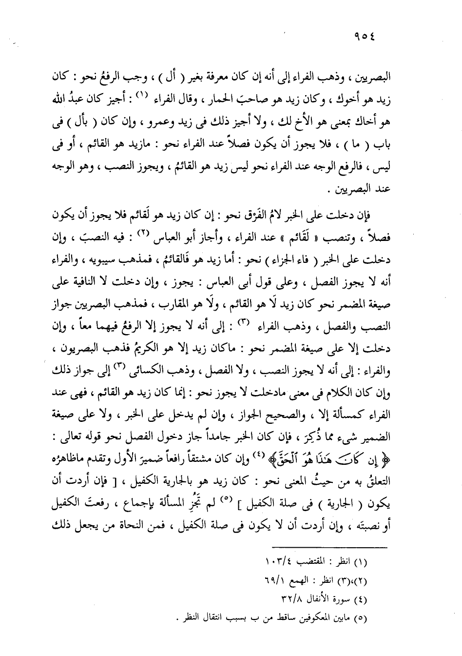 البصريين، وذهب الفراء إلى أنه إن كان معرفة بغير (أل)، وجب الرفع نحو: كان زيد هو أخوك، وكان زيد هو صاحب الحمار، وقال الفراء: أجيز كان عبد الله هو أخاك بمعنى هو الأخ لك، ولا أجيز ذلك في زيد وعمرو، وإن كان (بأل) في باب (ما)، فلا يجوز أن يكون فصلاً عند الفراء نحو: ما زيد هو القائم، أو في ليس، فالرفع الوجه عند الفراء نحو ليس زيد هو القائم، ويجوز النصب، وهو الوجه عند البصريين.