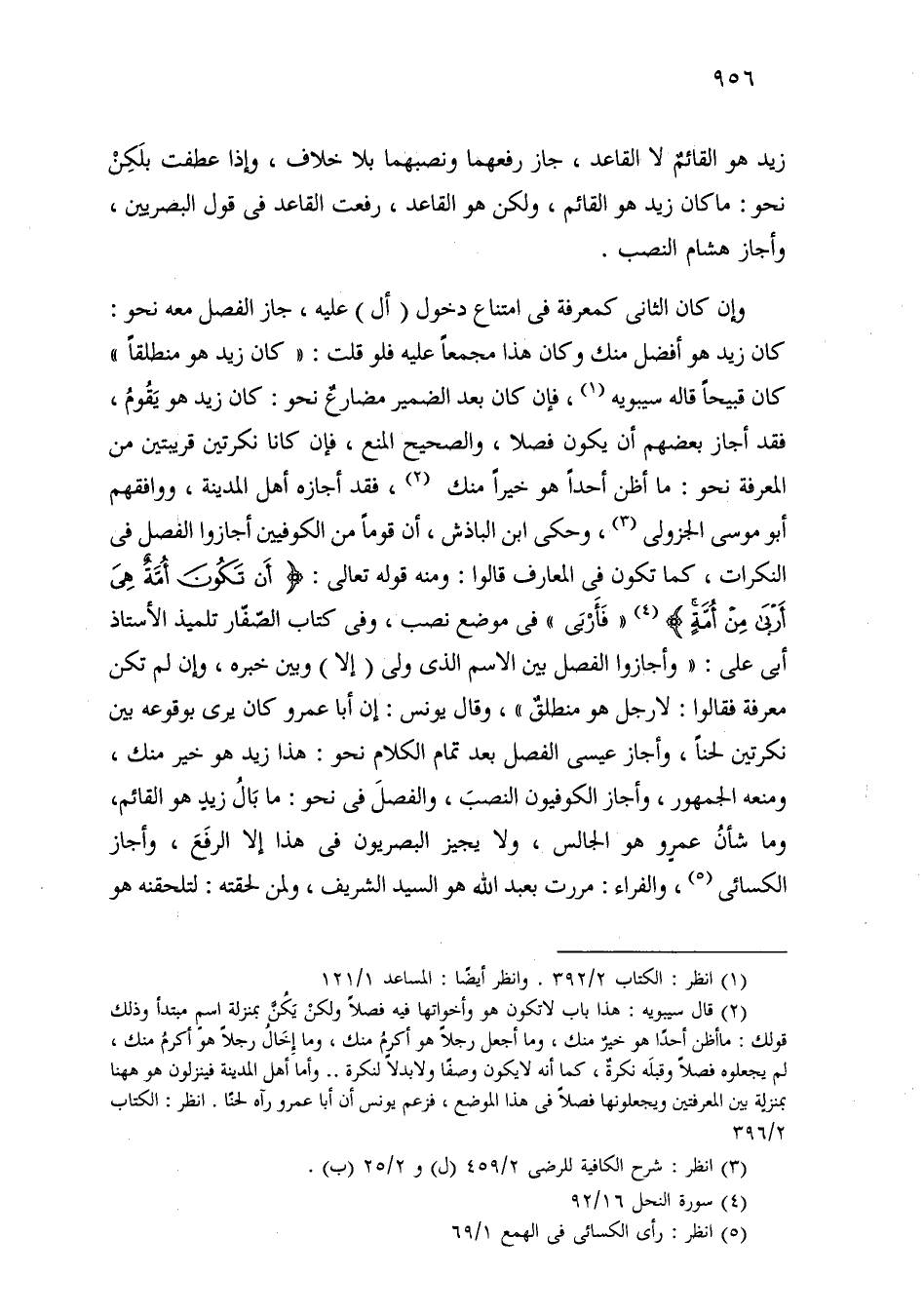 وإن كان الثاني كمعرفة في امتناع دخول (أل) عليه، جاز الفصل معه نحو: كان زيد هو أفضل منك وكان هذا مجمعًا عليه فلو قلت: «كان زيد هو منطلقًا» كان قبيحًا قاله سيبويه، فإن كان بعد الضمير مضارع نحو: كان زيد هو يقوم، فقد أجاز بعضهم أن يكون فصلا، والصحيح المنع، فإن كانا نكرتين قريبتين من المعرفة نحو: ما أظن أحدًا هو خيرًا منك، فقد أجازه أهل المدينة، ووافقهم أبو موسى الجزولي، وحكى ابن الباذش، أن قومًا من الكوفيين أجازوا الفصل في النكرات، كما تكون في المعارف قالوا: ومنه قوله تعالى: [أن تكون أمة هي أربى من أمة] «فأربى» في موضع نصب، وفي كتاب الصفار تلميذ الأستاذ أبي علي: «وأجازوا الفصل بين الاسم الذي ولى (إلا) وبين خبره، وإن لم تكن معرفة فقالوا: لا رجل هو منطلق»، وقال يونس: إن أبا عمرو كان يرى بوقوعه بين نكرتين لحنًا، وأجاز عيسى الفصل بعد تمام الكلام نحو: هذا زيد هو خير منك، ومنعه الجمهور، وأجاز الكوفيون النصب، والفصل في نحو: ما بال زيد هو القائم، وما شأن عمرو هو الجالس، ولا يجيز البصريون في هذا إلا الرفع، وأجاز الكسائي، والفراء: مررت بعبد الله هو السيد الشريف، ولمن لحقته: لتلحقنه هو