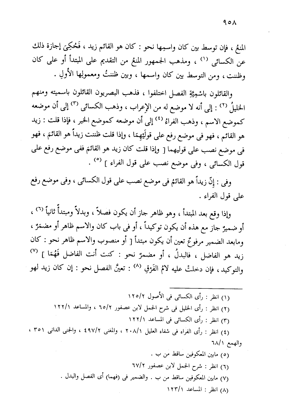 والقائلون باسمية الفصل اختلفوا، فذهب البصريون القائلون باسميته ومنهم الخليل: إلى أنه لا موضع له من الإعراب، وذهب الكسائي إلى أن موضعه كموضع الاسم، وذهب الفراء إلى أن موضعه كموضع الخبر، فإذا قلت: زيد هو القائم، فهو في موضع رفع على قوليهما، وإذا قلت ظننت زيدًا هو القائم، فهو في موضع نصب على قوليهما [وإذا قلت كان زيد هو القائم ففي موضع رفع على قول الكسائي، وفي موضع نصب على قول الفراء]