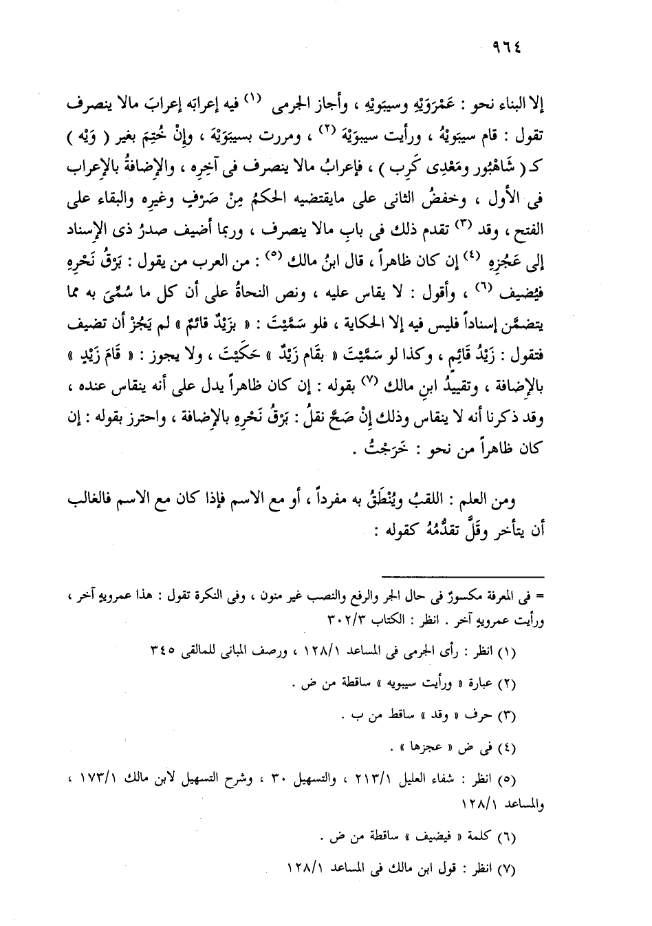 إلا البناء نحو: عمرويه وسيبويه، وأجاز الجرمي فيه إعرابه إعراب ما لا ينصرف تقول: قام سيبويه، ورأيت سيبويه، ومررت بسيبويه، وإن ختم بغير (ويه) كـ (شاهبور ومعدى كرب)، فإعراب ما لا ينصرف في آخره، والإضافة بالإعراب في الأول، وخفض الثاني على ما يقتضيه الحكم من صرف وغيره والبقاء على الفتح، وقد تقدم ذلك في باب ما لا ينصرف، وربما أضيف صدر ذي الإسناد إلى عجزه إن كان ظاهرًا، قال ابن مالك: من العرب من يقول: برق نحره فيضيف، وأقول: لا يقاس عليه، ونص النحاة على أن كل ما سمي به مما يتضمن إسنادًا فليس فيه إلا الحكاية، فلو سميت: «بزيد قائم» لم يجز أن تضيف فتقول: زيد قائم، وكذا لو سميت «بقام زيد» حكيت، ولا يجوز: «قام زيد» بالإضافة، وتقييد ابن مالك بقوله: إن كان ظاهرًا يدل على أنه ينقاس عنده، وقد ذكرنا أنه لا ينقاس وذلك إن صح نقل: برق نحره بالإضافة، واحترز بقوله: إن كان ظاهرًا من نحو: خرجت.