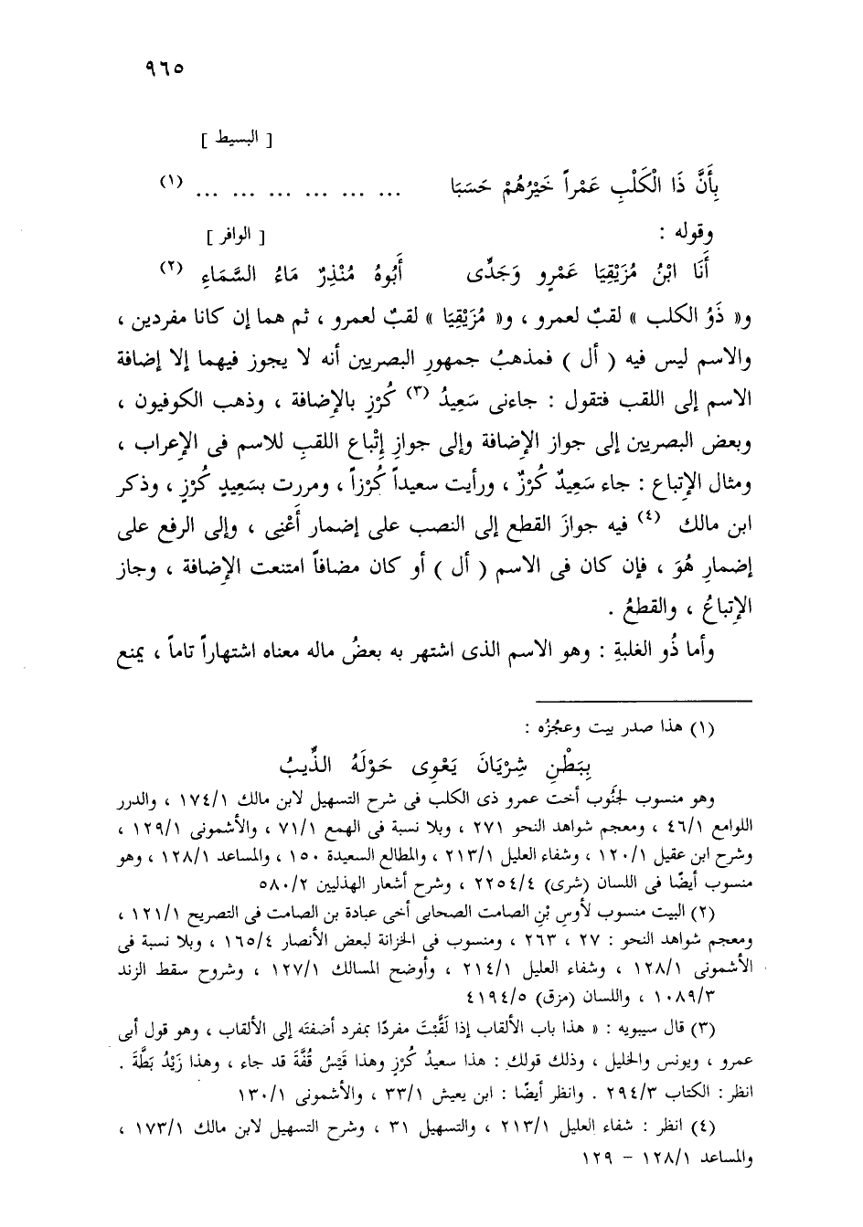 و «ذو الكلب» لقب لعمرو، و «مزيقيا» لقب لعمرو، ثم هما إن كانا مفردين، والاسم ليس فيه (أل) فمذهب جمهور البصريين أنه لا يجوز فيهما إلا إضافة الاسم إلى اللقب فتقول: جاءني سعيد كرز بالإضافة، وذهب الكوفيون، وبعض البصريين إلى جواز الإضافة وإلى جواز اتباع اللقب للاسم في الإعراب، ومثال الاتباع: جاء سعيد كرز، ورأيت سعيدًا كرزًا، ومررت بسعيد كرز، وذكر ابن مالك فيه جواز القطع إلى النصب على إضمار أعني، وإلى الرفع على إضمار هو، فإن كان في الاسم (أل) أو كان مضافًا امتنعت الإضافة، وجاز الاتباع، والقطع.