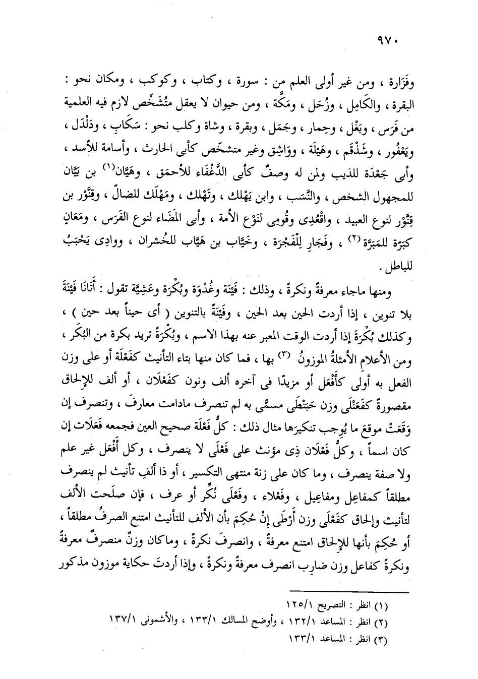 وفزارة، ومن غير أولي العلم من: سورة، وكتاب، وكوكب، ومكان نحو: البقرة، والكامل، وزحل، ومكة، ومن حيوان لا يعقل متشخص لازم فيه العلمية من فرس، وبغل، وحمار، وجمل، وبقرة، وشاة وكلب نحو: سكاب، ودلدل، ويعفور، وشذقم، وهيلة، وواشق وغير متشخص كأبي الحارث، وأسامة للأسد، وأبي جعدة للذيب ولمن له وصف كأبي الدغفاء للأ؛ مق، وهيان بن بيان للمجهول الشخص، والنسب، وابن يهلك، وتهلك، ومهلك للضال، وقنور بن قنور لنوع العبيد، واقعدي وقومي لنوع الأمة، وأبي المضاء لنوع الفرس، ومعان كبرة للمبرة، وفجار للفجرة، وخياب بن هياب للخسران، ووادي يحبب للباطل.