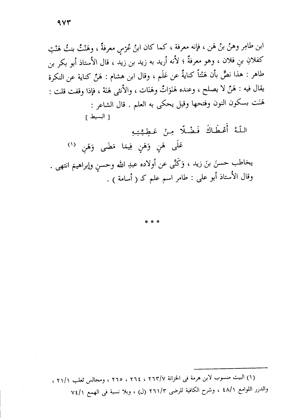 ابن طامر وهن بن هن، فإنه معرفة، كما كان ابن عرس معرفة، وهنت بنت هنت كفلان بن فلان، وهو معرفة؛ لأنه أريد به زيد بن زيد، قال الأستاذ أبو بكر بن طاهر: هذا نص بأن هنتًا كناية عن علم، وقال ابن هشام: هن كناية عن النكرة يقال فيه: هن لا يصلح، وعنده هنوات وهنات، والأنثى هنه، فإذا وقفت قلت: هنت بسكون النون وفتحها وقيل يحكى به العلم. قال الشاعر: