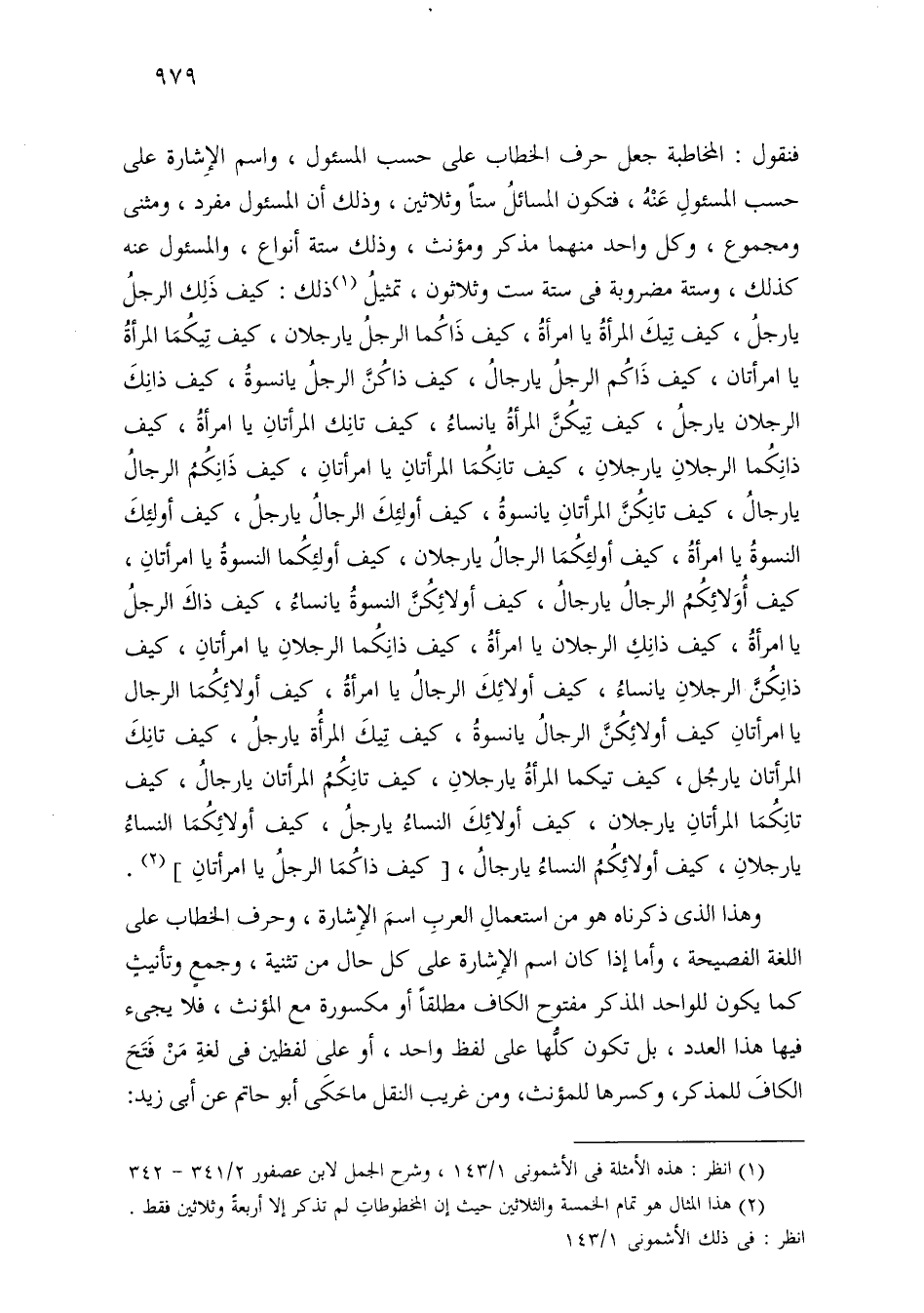 فنقول: المخاطبة جعل حرف الخطاب على حسب المسئول، واسم الإشارة على حسب المسئول عنه، فتكون المسائل ستًا وثلاثين، وذلك أن المسئول مفرد، ومثنى ومجموع، وكل واحد منهما مذكر ومؤنث، وذلك ستة أنواع، والمسئول عنه كذلك، وستة مضروبة في ستة ست وثلاثون، تمثيل ذلك: كيف ذلك الرجل يا رجل، كيف تيك المرأة يا امرأة، كيف ذاكما الرجل يا رجلان، كيف تيكما المرأة يا امرأتان، كيف ذاكم الرجل يا رجال، كيف ذاكن الرجل يا نسوة، كيف ذانك الرجلان يا رجل، كيف تيكن المرأة يا نساء، كيف تانك المرأتان يا امرأة، كيف ذانكما الرجلان يا رجلان، كيف تانكما المرأتان يا امرأتان، كيف ذانكم الرجال يا رجال، كيف تانكن المرأتان يا نسوة، كيف أولئك الرجال يا رجل، كيف أولئك النسوة يا امرأة، كيف أولئكما الرجال يا رجلان، كيف أولئكما النسوة يا امرأتان، كيف أولائكم الرجال يا رجال، كيف أولئكن النسوة يا نساء، كيف ذاك الرجل يا أمراة، كيف ذانك الرجلان يا امرأة، كيف ذانكما الرجلان يا امرأتان، كيف ذانكن الرجلان يا نساء، كيف أولائك الرجال يا امرأة، كيف أولائكما الرجال يا امرأتان كيف أولائكن الرجال يا نسوة، كيف تيك المرأة يا رجل، كيف تانك المرأتان يا رجل، كيف تيكما المرأة يا رجلان، كيف تانكم المرأتان يا رجال، كيف تانكما المرأتان يا رجلان، كيف أولائك النساء يا رجل، كيف أولائكما النساء يا رجلان، كيف أولائكم النساء يا رجال، [كيف ذاكما الرجل يا امرأتان].