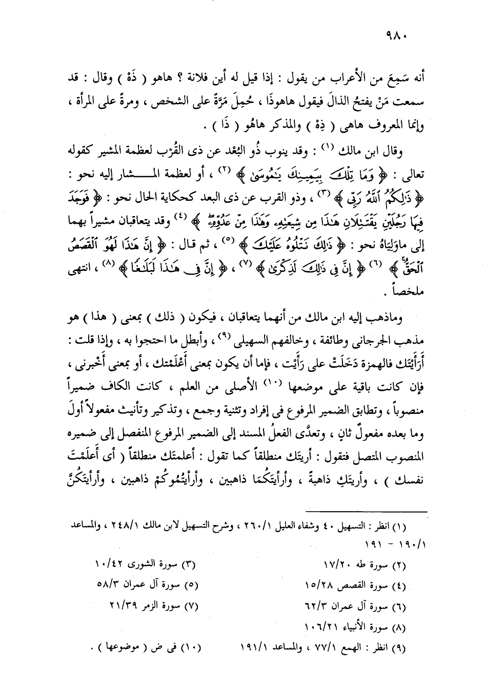 وقال ابن مالك: وقد ينوب ذو البعد عن ذي القرب لعظمة المشير كقوله تعالى: [وما تلك بيمينك يا موسى]، أو لعظمة المشار إليه نحو: [ذالكم الله ربي]، وذو القرب عن ذي البعد كحكاية الحال نحو: [فوجد فيها رجلين يقتتلان هذا من شيعته وهذا من عدوه] وقد يتعاقبان مشيرًا بهما إلى ما ولياه نحو: [ذلك نتلوه عليك]، ثم قال: [إن هذا لهو القصص الحق] [إن في ذلك لذكرى]، [إن في هذا لبلاغا]، انتهى ملخصًا.