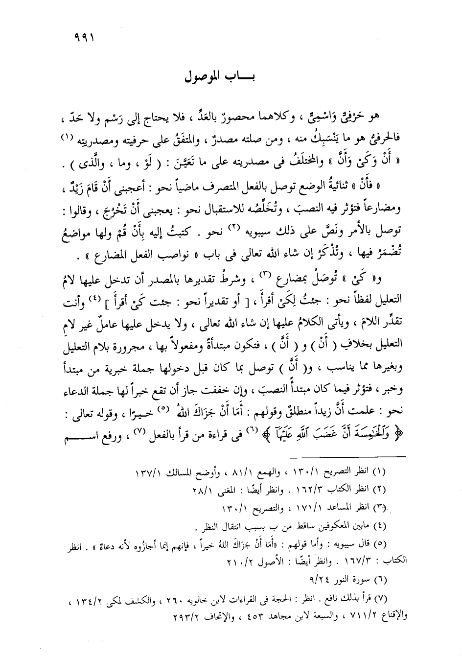و «كي» توصل بمضارع، وشرط تقديرها بالمصدر أن تدخل عليها لام التعليل لفظًا نحو: جئت لكي أقرأ، [أو تقديرًا نحو: جئت كي أقرأ] وأنت تقدر اللام، ويأتي الكلام عليها إن شاء الله تعالى، ولا يدخل عليها عامل غير لام التعليل بخلاف (أن) و (أن)، فتكون مبتدأ ومفعولاً بها، مجرورة بلام التعليل وبغيرها مما يناسب، و (أن) توصل بما كان قبل دخولها جملة خبرية من مبتدأ وخبر، فتؤثر فيما كان مبتدأ النصب، وإن خففت جاز أن تقع خبرًا لها جملة الدعاء نحو: علمت أن زيدًا منطلق وقولهم: أما أن جزاك الله خيرًا، وقوله تعالى: [والخامسة أن غضب الله عليها] في قراءة من قرأ بالفعل، ورفع اسم