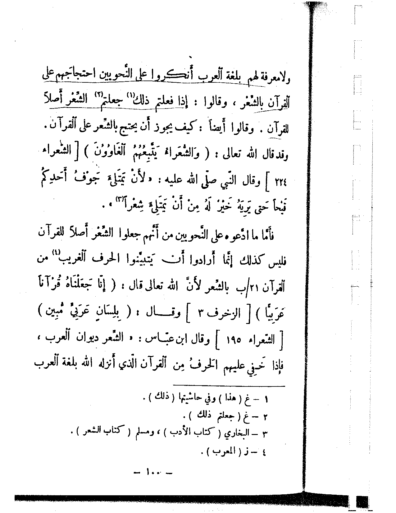فأما ما ادعوه على النحويين من أنهم جعلوا الشعر أصلاً للقرآن فليس كذلك إنما أرادوا أن يتبينوا الحرف الغريب من القرآن بالشعر لأن الله تعالى قال: {إنا جعلناه قرآنا عربيا} [الزخرف: 3] وقال: {بلسان عربي مبين} [الشعراء: 195] وقال ابن عباس: «الشعر ديوان العرب، فإذا خفي عليهم الحرف من القرآن الذي أنزله الله بلغة العرب