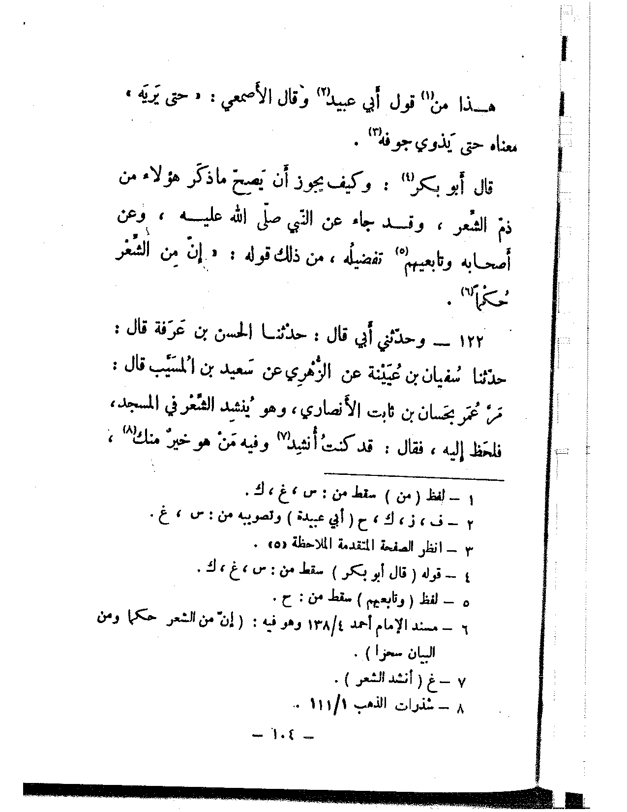 122 - وحدثني أبي قال: حدثنا الحسن بن عرفة ضال: حدثنا سفيان بن عيينة عن الزهري عن سعيد بن المسيب قال: مر عمر بحسان بن ثابت الأنصاري، وهو ينشد الشعر في المسجد، فلحظ إليه، فقال: قد كنت أنشد وفيه من هو خير منك،