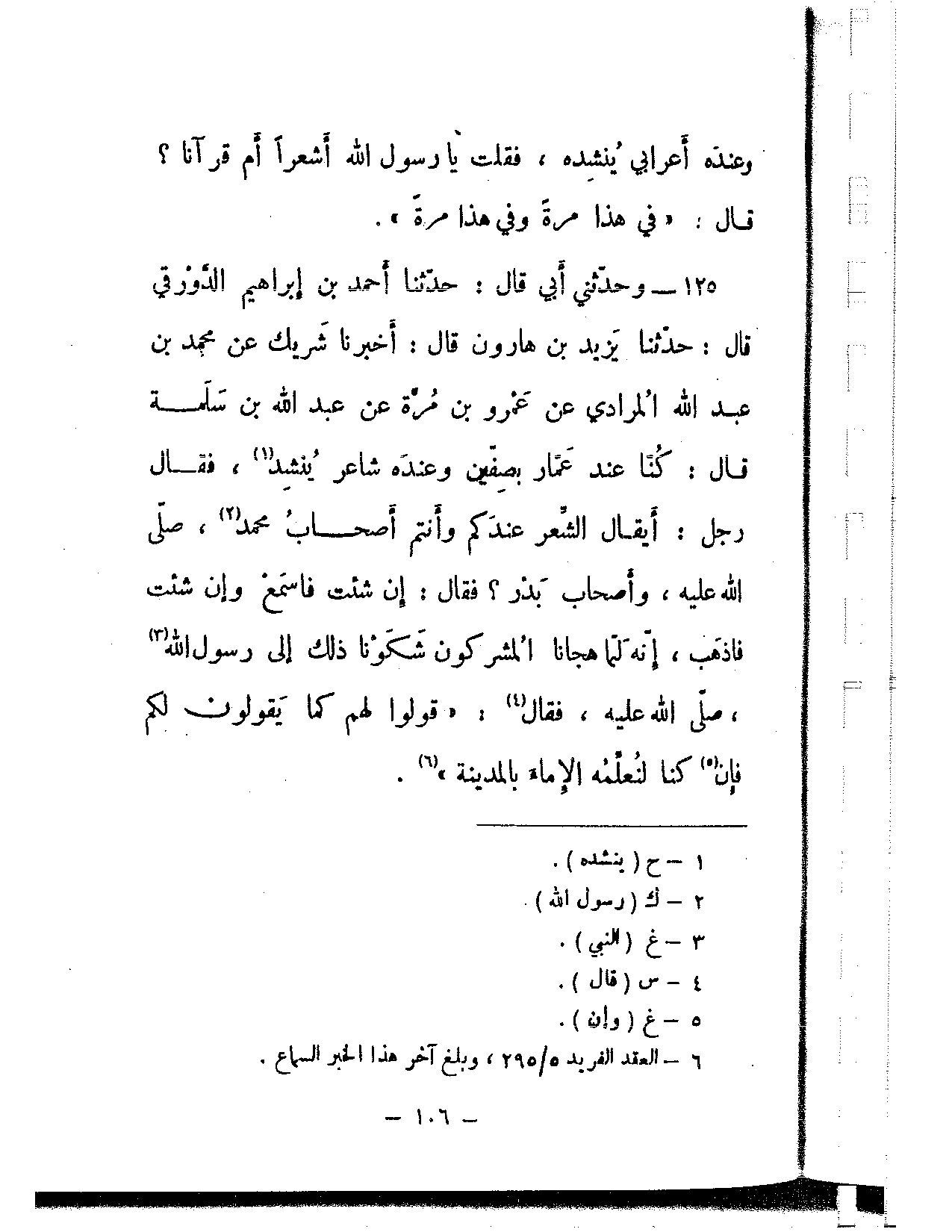 125 - وحدثني أبي قال: حدثنا أحمد بن إبراهيم الدورقي قال: حدثنا يزيد بن هارون قال: أخبرنا شريك عن محمد بن عبد الله المرادي عن عمرو بن مرة عن عبد الله بن سلمة قال: كنا عند عمار بصفين وعنده شاعر ينشد، فقال رجل: أيقال الشعر عندكم وأنتم أصحاب محمد، صلى الله عليه وسلم، وأصحاب بدر؟ فقال: إن شئت فاسمع وإن شئت فاذهب، إنه لما هجانا المشركون شكونا ذلك إلى رسول الله صلى الله عليه وسلم فقال: «قولوا لهم كما يقولون لكم فإن كنا لنعلمه الإماء بالمدينة».