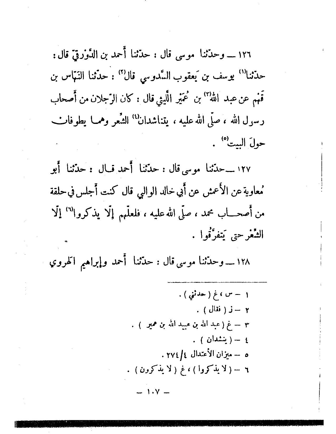 126 - وحدثنا موسى قال: حدثنا أحمد بن الدورقي قال: حدثنا يوسف بن يعقوب السدوس قال: حدثنا النهاس بن قهم عن عبد الله بن عمير الليثي قال: كان الرجلان من أصحاب رسول الله صلى الله عليه وسلم يتناشدان الشعر وهما يطوفان حول البيت.
