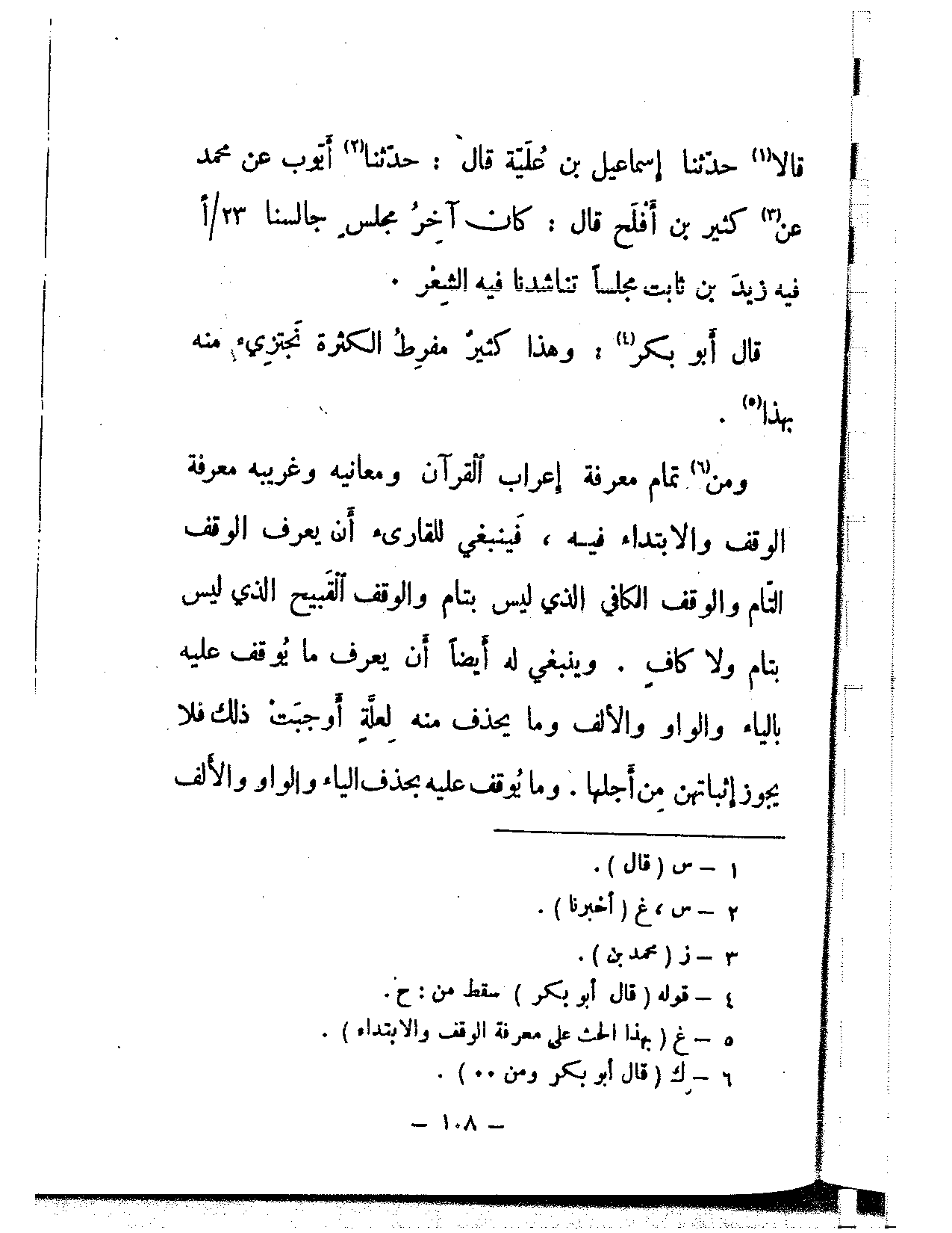 ومن تمام معرفة إعراب القرآن ومعانيه وغريبه معرفة الوقف والابتداء فيه، فينبغي للقارئ أن يعرف الوقف التام والوقف الكافي الذي ليس بتام والوقف القبيح الذي ليس بتام ولا كاف. وينبغي له أيضًا أن يعرف ما يُوقف عليه بالياء والواو والألف وما يحذف منه لعلة أوجبت ذلك فلا يجوز إثباتهن من أجلها. وما يُوقف عليه بحذف الياء والواو والألف