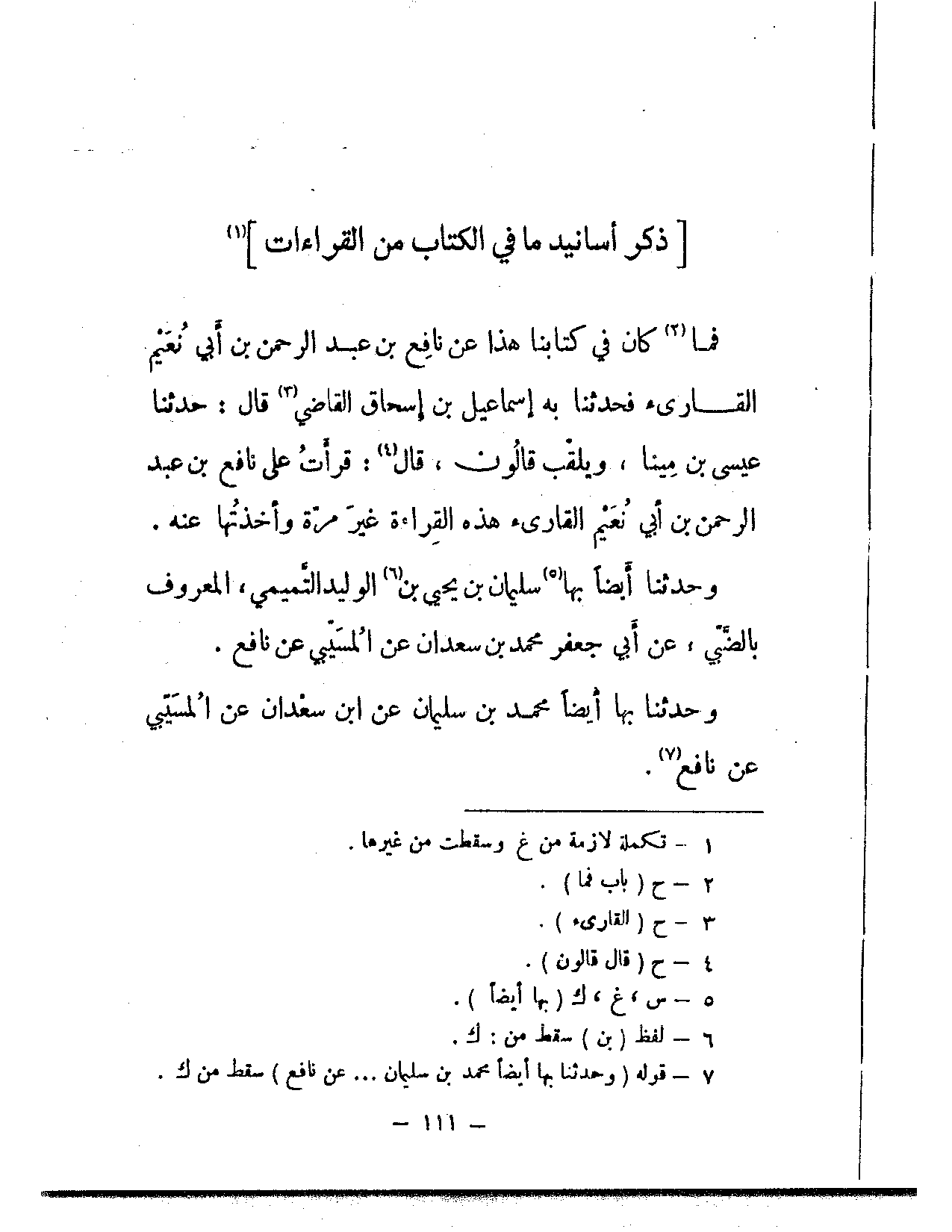 فما كان في كتابنا هذا عن نافع بن عبد الرحمن بن أبي نعيم القارئ فحدثنا به إسماعيل بن إسحاق القاضي قال: حدثنا عيسى بن مينا، ويلقب قالون، قال: قرأت على نافع بن عبد الرحمن بن أبي نعيم القارئ هذه القراءة غير مرة وأخذتها عنه.