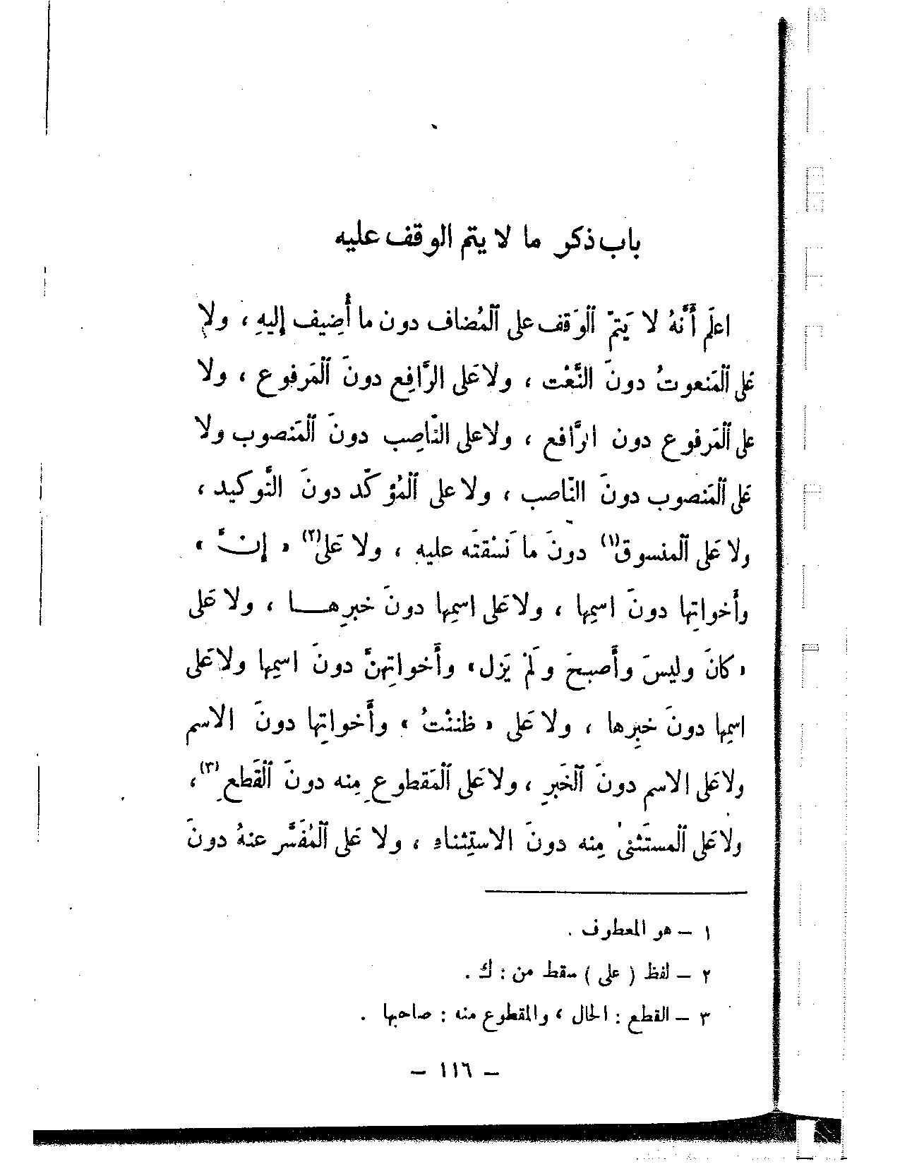 اعلم أنه لا يتم الوقف على المضاف دون ما أُضيف إليه، ولا على المنعوت دون النعت، ولا على الرافع دون المرفوع، ولا على المرفوع دون الرافع، ولا على الناصب دون المنصوب ولا على المنصوب دون الناصب، ولا على المؤكد دون التوكيد، ولا على المنسوق دون ما نسقته عليه، ولا على «إن» وأخواتها دون اسمها، ولا على اسمها دون خبرها، ولا على «كان وليس وأصبح ولم يزل» وأخواتهن دون اسمها ولا على اسمها دون خبرها، ولا على «ظننت» وأخواتها دون الاسم ولا على الاسم دون الخبر، ولا على المقطوع منه دون القطع، ولا على المستثنى منه دون الاستثناء، ولا على المفسر عنه دون
