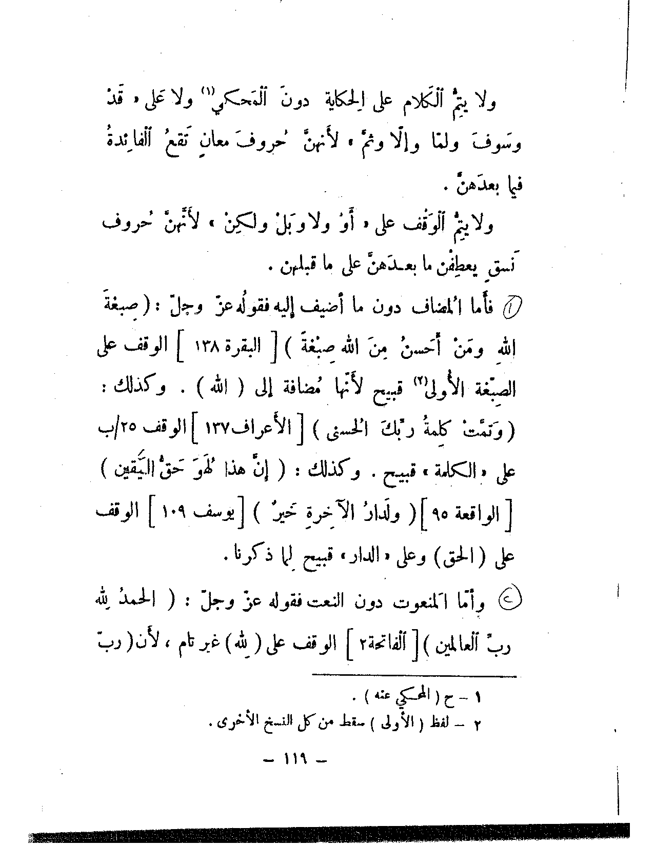 فأما المضاف دون ما أضيف إليه فقوله عز وجل: {صبغة الله ومن أحسن من الله صبغة} [البقرة: 138] الوقف على الصبغة الأولى قبيح لأنها مضافة إلى (الله). وكذلك: {وتمت كلمة ربك بالحسنى} [الأعراف: 137] الوقف على «الكلمة» قبيح. وكذلك: {إن هذا لهو حق اليقين} [الواقعة: 95] {ولدار الآخرة خير} [يوسف: 109] الوقف على (الحق) وعلى «الدار» قبيح لما ذكرنا.