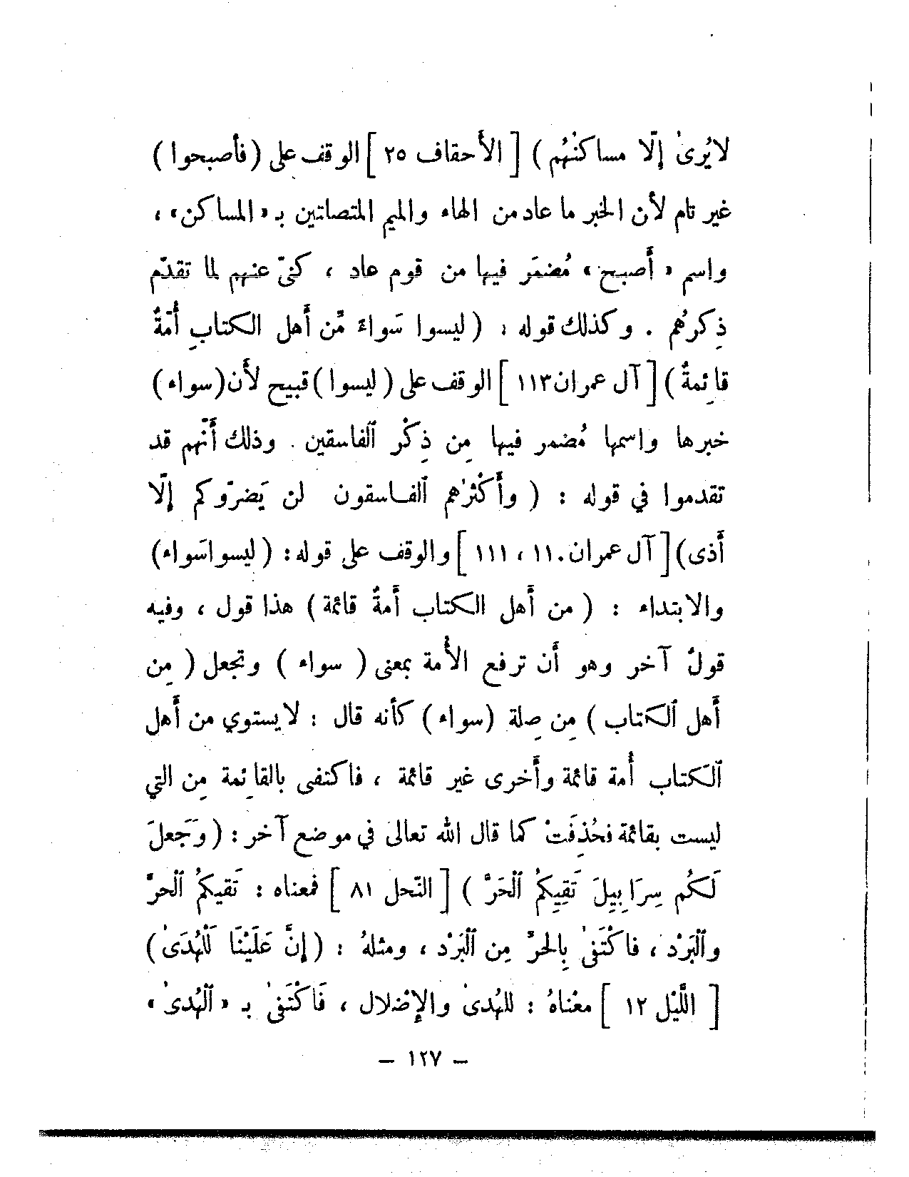 لا يرى إلا مساكنهم} [الأحقاف: 25] الوقف على فأصبحوا غير تام لأن الخبر ما عاد من الهاء والميم المتصلتين بـ «المساكن»، واسم «أصبح» مضمر فيها من قوم عاد، كني عنهم لما تقدم ذكرهم. وكذلك قوله: {ليسوا سواء من أهل الكتاب أمة قائمة} [آل عمران: 113] الوقف على ليسوا قبيح لأن سواء خبرها واسمها مضمر فيها من ذكر الفاسقين. وذلك أنهم قد تقدموا في قوله: {وأكثرهم الفاسقون لن يضروكم إلا أذى} [آل عمران: 110، 111] والوقف على قوله: (ليسوا سواء) والابتداء: (من أهل الكتاب أمة قائمة) هذا قول، وفيه قول آخر وهو أن ترفع الأمة بمعنى سواء وتجعل (من أهل الكتاب) من صلة سواء كأنه قال: لا يستوي من أهل الكتاب أمة قائمة وأخرى غير قائمة، فاكتفى بالقائمة من التي ليست بقائمة فحذفت كما قال الله تعالى في موضع آخر: {وجعل لكم سرابيل تقيكم الحر} بالنحل: 81] فمعناه: تقيكم الحر والبرد، فاكتفى بالحر من البرد، ومثله: {إن علينا للهدى} [الليل: 12] معناه: للهدى والإضلال، فاكتفى بـ «الهدى»